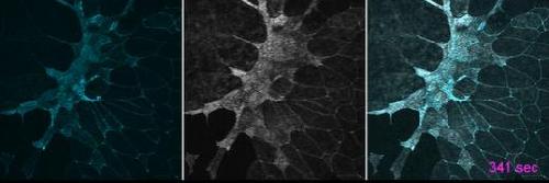 Movie S5: Coordinated increase in MyoIIB and F-actin intensity during bottle cell formation. Cyan, MyoIIB-GFP, gray, Utrophin-RFP.