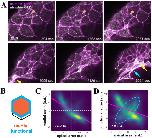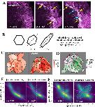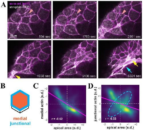 FIGURE 2:. Dynamic F-actin remodeling accompanies apical surface reduction during bottle cell formation. (A) Selected frames from a time-lapse movie demonstrate dynamic F-actin organization before an overt decrease in apical cell area (top panels). The dynamic F-actin signal in a single cell is marked by the arrowheads. As apical constriction commences, groups of cells constrict first and take round shape (yellow arrow), with neighboring, later-constricting cells assuming fusiform (blue arrow). The clusters of round cells can appear as one large cell as cell constriction and F-actin signal increase often obscure cell boundaries (e.g., the cluster indicated by the yellow arrow at the 6324 s frame consists of five constricted cells seen in the time-lapse movie). (B) Schematics of quantification of medial (orange) and junctional (blue) F-actin intensity within single cells. (C, D) Density plots of apical cell area vs. medial (C) and junctional (D) F-actin. Magenta line indicates linear model. s.d. = standard deviations. n = 11,748 observations of 132 cells from four embryos. (C) A negative correlation of medial F-actin intensity and apical area is uncovered, with the correlation coefficient r value of –0.62. (D) Junctional F-actin intensity is also negatively correlated with the apical area, though less so with the r value of –0.33. This weaker correlation may be in part due to a subpopulation of cells with a positive correlation between junctional F-actin and the apical area (dashed cyan ellipsis).