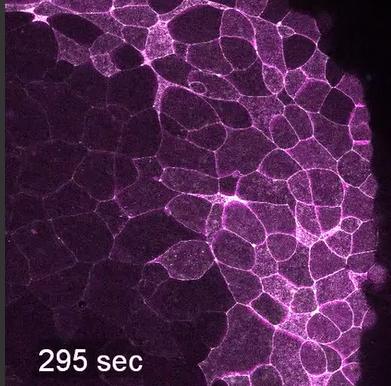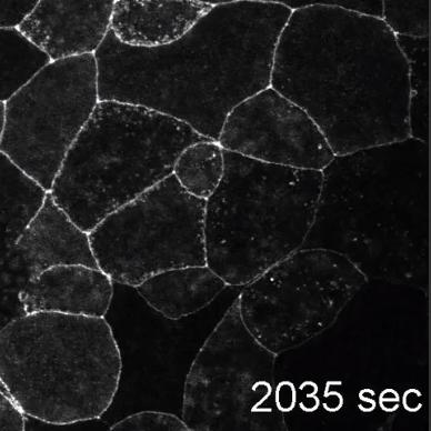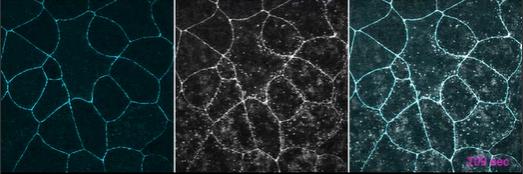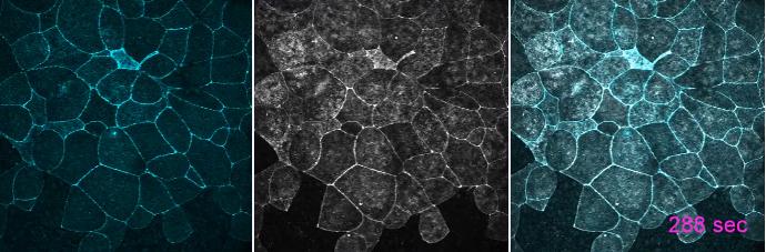 Movie S7: Knockdown of plekhg5 prevents accumulation of MyoIIB and F-actin in both medial and junctional regions. Cyan, MyoIIB-GFP, gray, Utrophin-RFP.