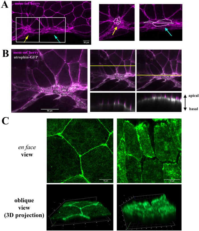 FIGURE 1:. Distinct cell shapes, apical actin accumulation, and F-actin bundles in bottle cells. (A) Membrane mCherry–labeled bottle cells show two distinct morphologies, with round cells (yellow arrow) interspersed with fusiform cells (blue arrow). The panels on the right are the enlarged images of the boxed areas. (B) Coexpression of membrane mCherry with utrophin-GFP reveals accumulation of F-actin predominantly in the medial regions of apical cell cortex. The right two panels show the z-view of F-actin and mem-mCherry signals in regions without or with apical constriction. (C) En face images of phalloidin-stained fixed gastrula embryos show predominant cell junction localization of F-actin in not-yet-constricting cells (left top panel), whereas F-actin intensity is enhanced in the apical compartment of constricting cells (right top panel). Oblique views of 3D projections of the images reveal formation of dense F-actin bundles perpendicular to the apical surface in the constricting bottle cells (right bottom panel).