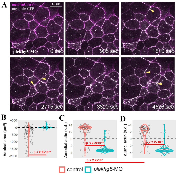 FIGURE 4:. Knockdown of plekhg5 prevents apical accumulation of F-actin and reduction of apical cell size. (A) Selected frames from a time-lapse movie show that despite the initial F-actin dynamics and formation of F-actin puncta, the cells with plekhg5 knockdown fail to increase apical F-actin signal or reduce the apical surface. Instead, junctional F-actin flares can be seen frequently. The arrowheads point to examples of F-actin flares. (B) Quantification of apical cell area demonstrates that unlike cells in control embryos (Supplemental Movies 1 and 2), cells from plekhg5 knockdown embryos (Supplemental Movies 3 and 4) cannot reduce their apex efficiently. (C, D) While medial and junctional F-actin intensity increases during apical constriction of bottle cells in control embryos, the intensity of medial and junctional F-actin decreases in cells from plekhg5 knockdown embryos. Each dot is an individual cell. Horizontal lines within each violin delineate quartiles along each distribution. s.d. = standard deviations. P values were calculated via a KS test. Data were collected from four control and five plekhg5 knockdown embryos.