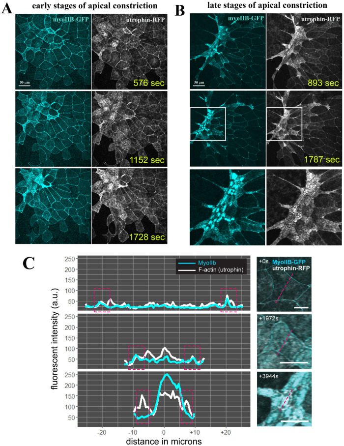 FIGURE 5:. Coordinated enrichment of apical myosin IIB and F-actin during apical constriction of bottle cells. (A) Selected frames of a time-lapse movie reveal coordinated increase in MyoIIB and F-actin signals in the apical cortex of the bottle cells. The signal intensity of actomyosin inversely correlates with the apical cell area of the cells. The stretching of neighboring nonconstricting cells can also be seen. (B) During the late stage of apical constriction, the MyoIIB signal is down-regulated from cell junctions and is concentrated in the center of the bottle cells. F-actin signal can be seen in both the cell junctions and the medioapical region. Close-up view of the boxed regions is shown in the bottom panels. (C) Histogram of F-actin and MyoIIB signal intensity at the beginning, in the middle, and at the end of the apical constriction of the bottle cells reveals distinct patterns. While both medial and junctional F-actin and MyoIIB signals increase initially during bottle cell formation, junctional MyoIIB is reduced at the end of apical constriction while junctional F-actin remains strong. Approximate junctional region highlighted by dashed magenta boxes in left panels. Dashed magenta lines in right panels indicate quantified region of each cell.