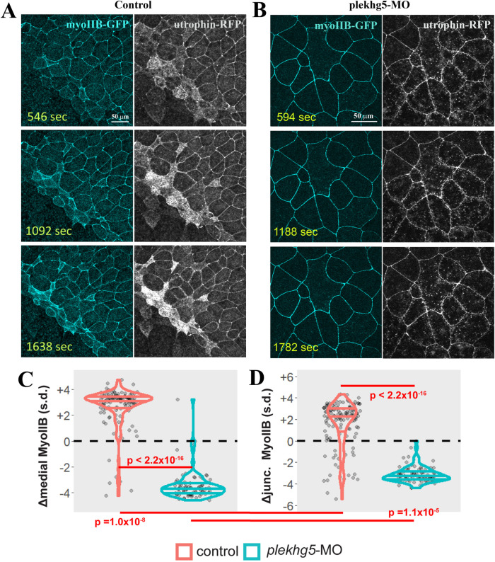 FIGURE 6:. Knockdown of plekhg5 prevents medial accumulation of MyoIIB. (A, B) Unlike cells in control embryos, in plekhg5 knockdown embryos, initial F-actin dynamics remains in the apical cortex but MyoIIB fails to show up in the medial domain. No actomyosin enrichment is observed with progression of time. (C, D) Quantification of medial and junctional MyoIIB intensity shows that unlike in control bottle cells where the intensity of MyoIIB increases, medial and junctional MyoIIB decrease in cells with plekhg5 knockdown. Each dot is an individual cell. Horizontal lines within each violin delineate quartiles along each distribution. s.d. = standard deviations. P values were calculated via a KS test. Data were collected from four control and five plekhg5 knockdown embryos.