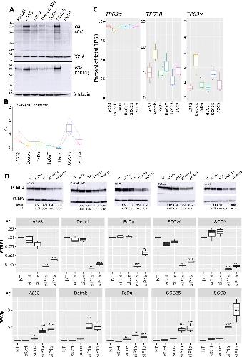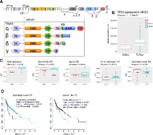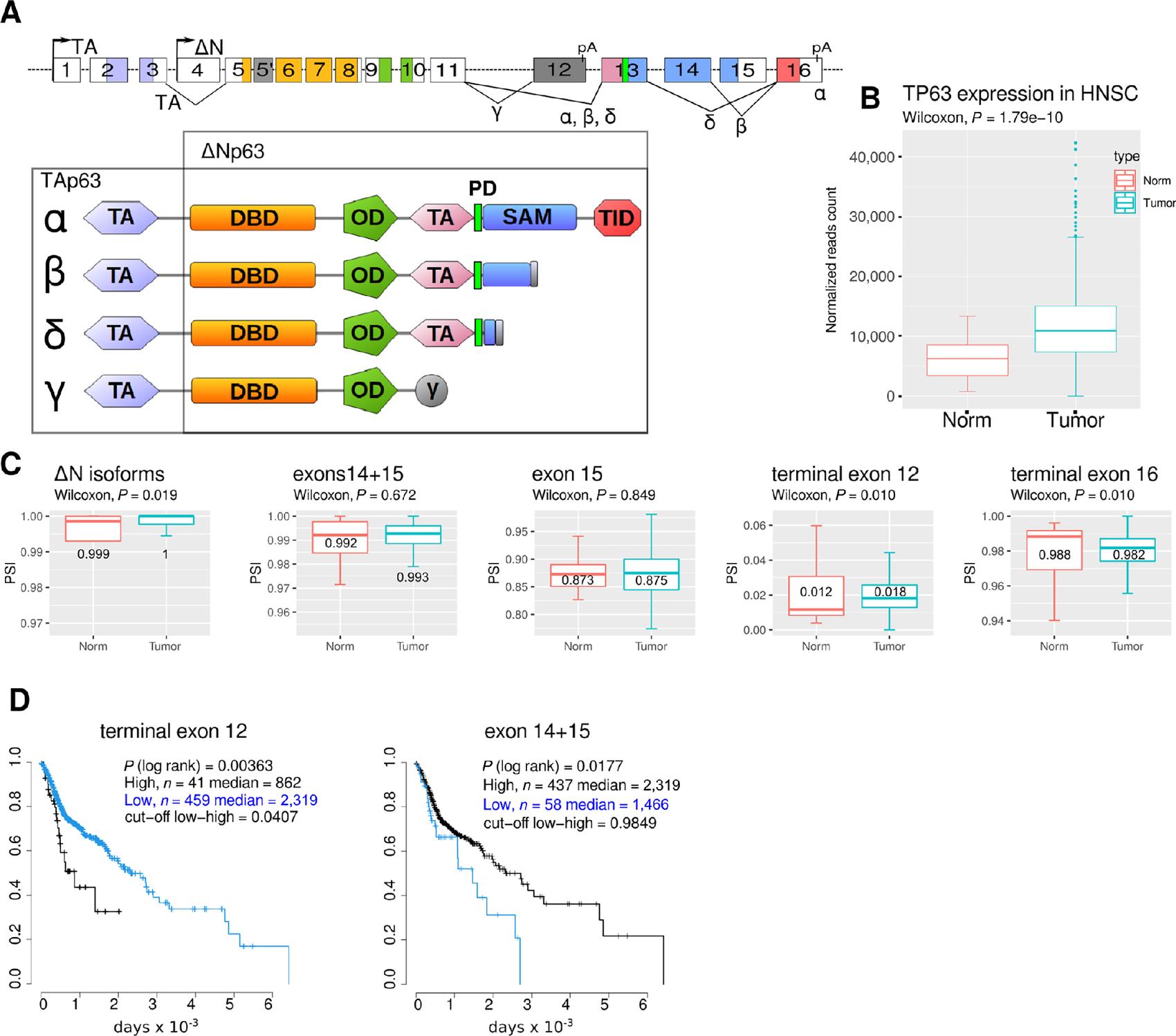 TP63 splicing from patients with HNSCC. A,TP63 exon/intron structure (top diagram) and corresponding encoded protein isoforms with color-encoded peptidic domains. TA, ΔN denote the promoters. Exons are numbered according to GTEX. Alternatively spliced junctions and CPA events are indicated with solid lines joining exons and pA, respectively. Terminal exon 16 is present in isoforms α, β, or δ, and terminal exon 12 in isoform γ. The cassette exons 14 and 15 are present in isoform α while the isoform β lacks exon 15 and the isoform δ lacks both. The exons are colored according to the domain structure. TA, transactivation domain; DBD, DNA-binding domain; OD, oligomerization domain; SAM, sterile alpha motif; TID, transactivation inhibitory domain; PD, phosphodegron. B, Genewise expression of TP63 in normal and tumor samples from patients with HNSCC. C, Quantification of TP63 splicing by measuring the inclusion of specific exons (PSI) in normal and tumor samples. The median PSI is indicated. Differential expression between normal and tumor samples is assessed using Wilcoxon rank-sum test. D, Patients were segregated on the basis of the high or low inclusion of exon 12 (threshold = 4.07%) or exon 14+15 (threshold = 98.49%) in tumor samples. Patient survival was assessed on a Kaplan–Meier graph in the two classes and statistical differences appraised by a log-rank test.