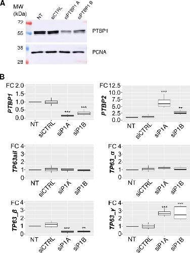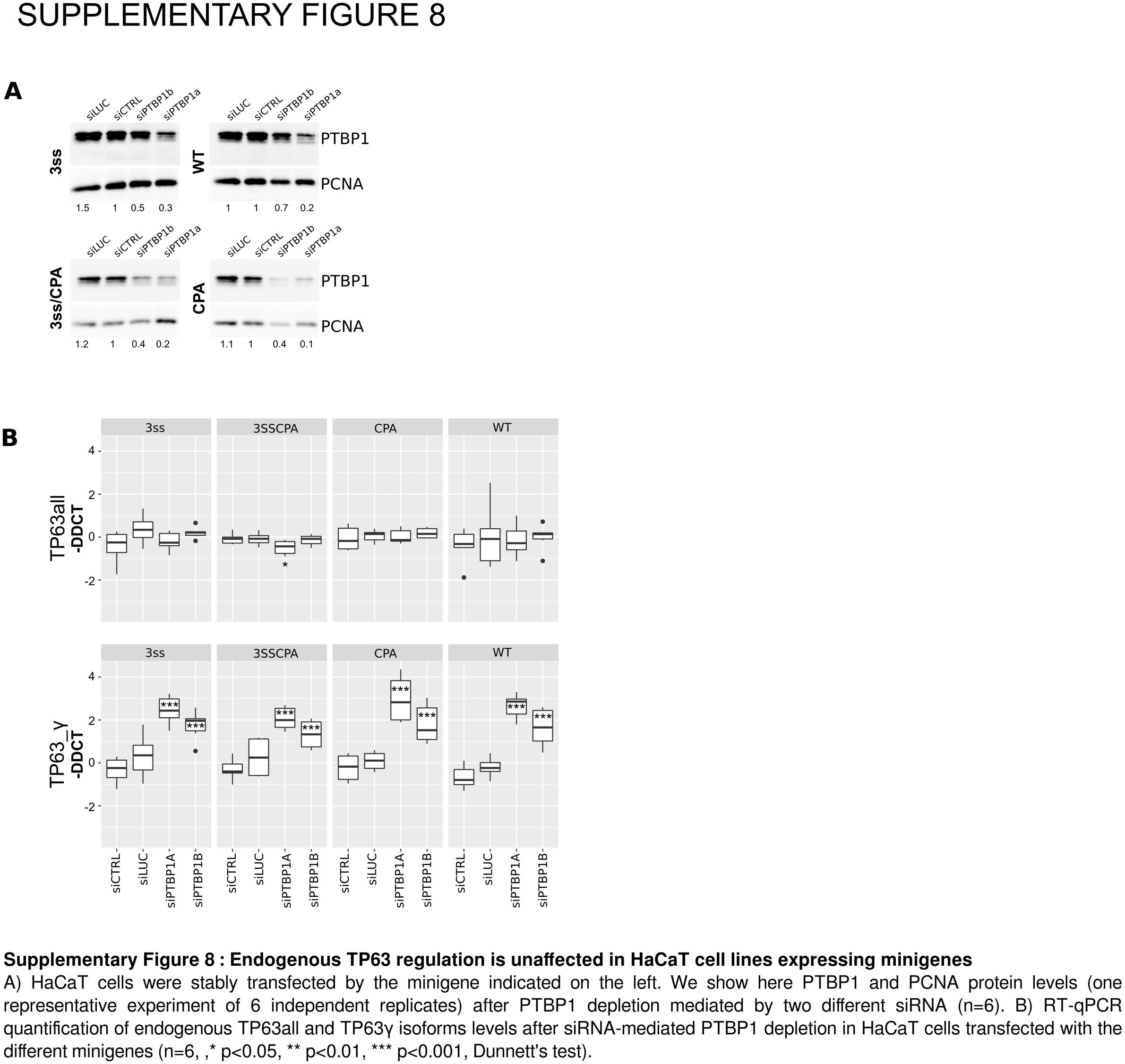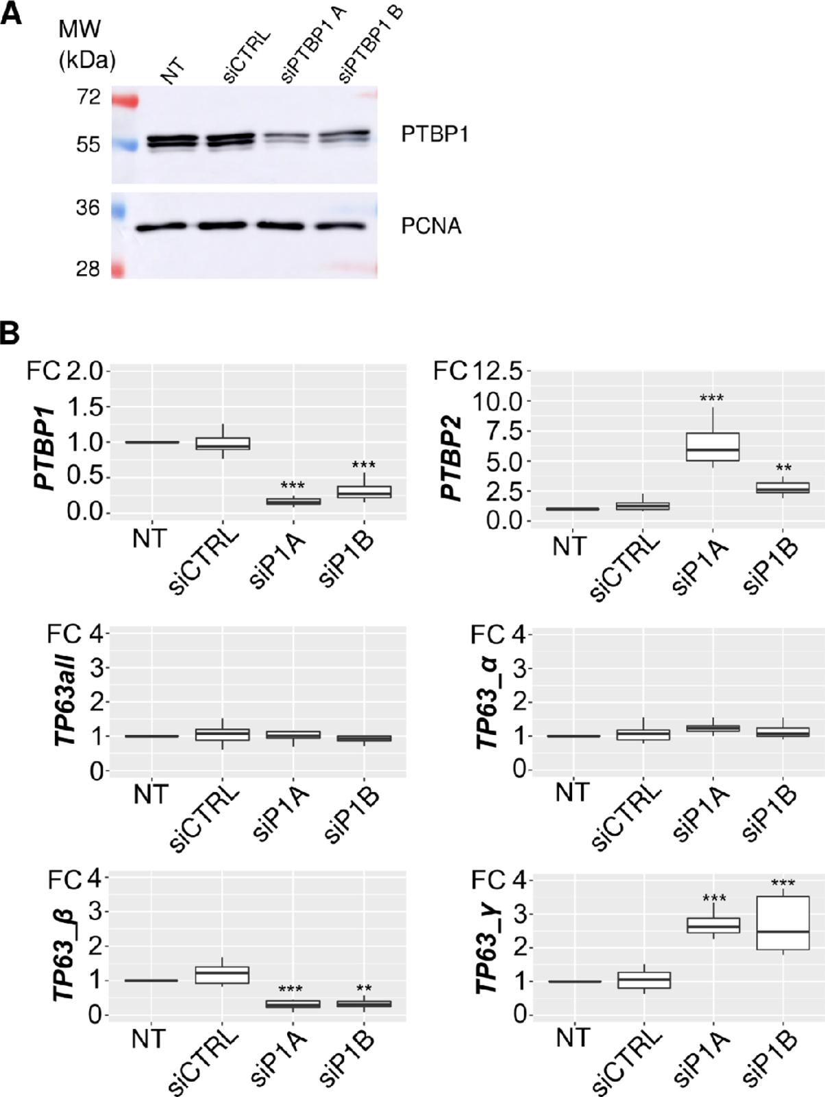 PTBP1 represses endogenous TP63 γ exon inclusion in HaCaT cells. A, Detection of PTBP1 in HaCaT cells after PTBP1 depletion mediated by two different siRNA. We show here a representative experiment of a triplicate. B, qRT-PCR quantification of endogenous PTBP1, PTBP2, TP63all and TP63α, β, and γ isoforms levels after siRNA-mediated PTBP1 depletion. n = 3; *, P < 0.05; **, P < 0.01; ***, P < 0.001; Dunnett test (n = 3, Dunnet test).
