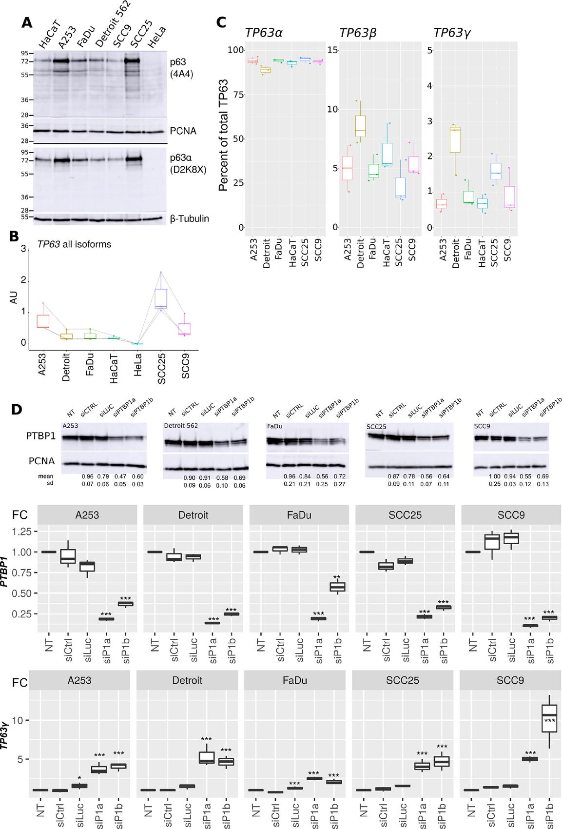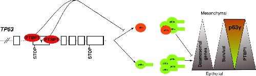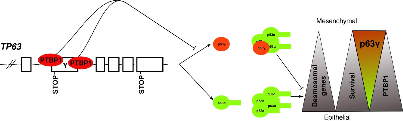 SIGNIFICANCE: Quantifying TP63γ isoforms in patients' tumors could allow for the early detection of patients with HNSCC with an early loss in desmosomal gene expression and poor prognostic. The identification of PTBP1 as a transacting factor controlling TP63γ production may allow to control TP63γ expression.