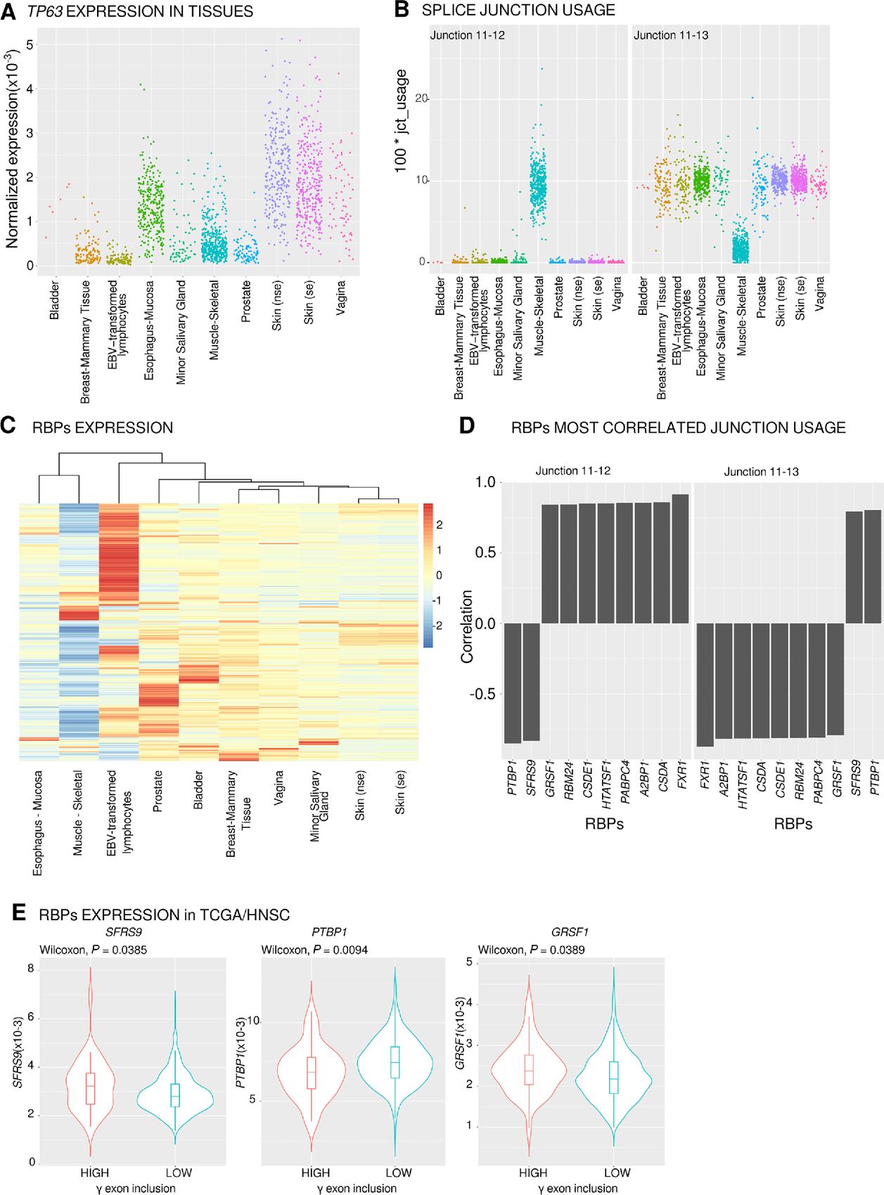 Identification of PTBP1 as an RBP correlated to TP63γ terminal exon splicing. A,TP63 gene expression in samples from TP63-expressing tissues (normalized reads count). se, nse, (non) sun exposed. B, Quantification of the usage of junctions 11–12 and 11–13 pertinent to γ-terminal exon inclusion. C, RBP expression heatmap and hierarchical clustering of tissues based on RBP expression from GTEX data. D, Top 10 RBPs most correlated to the junctions involved in γ exon inclusion (junction 11–12) or γ exon exclusion (junction 11–13). E, Expression of SFRS9, PTBP1, and GRSF1 in two classes of patients with high or low γ exon 12 inclusion in tumors (threshold = 4.07%).