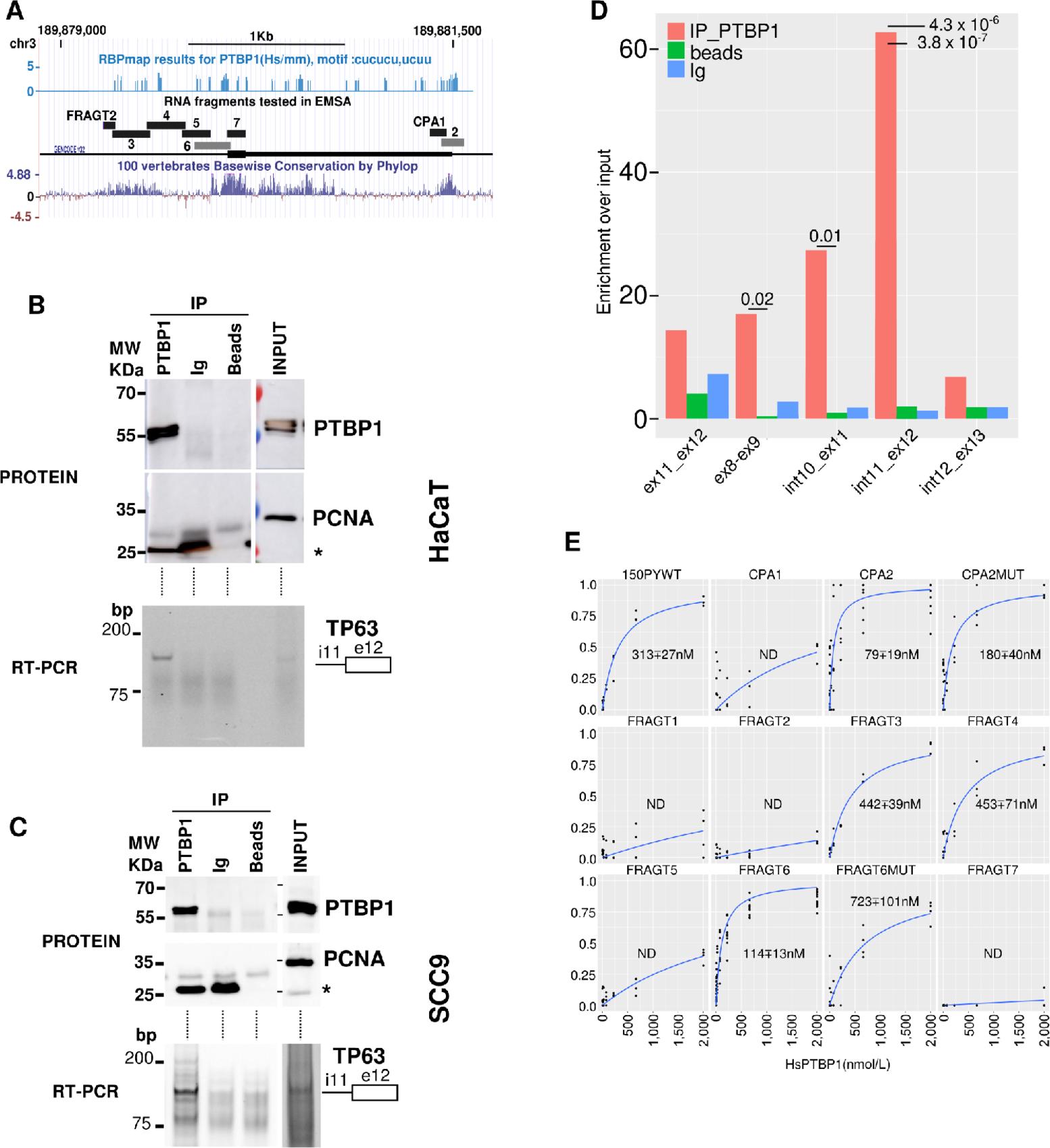 PTBP1 binds specifically to TP63 premRNA sequences. A,TP63 exon 12 genomic locus and positions of the RNAs tested in RNA/protein shift assays. Top lane, RBPmap predicted PTBP1 binding sites. Middle, Positions and names of the RNA fragments tested along the TP63 exon 12 genomic sequence. Bottom lane, nucleotidic conservation among vertebrates. B, Immunopurification of PTBP1/RNA complexes or control experiments (Ig and beads only) from HaCaT cell extracts. Immunopurification was controlled by PTBP1 and PCNA Western blot analysis as indicated in input (10%) or immunoprecipited (IP) samples (top). Protein MW are indicated on the side of the membranes. The asterisk denotes the light chain of the IgG. Bottom, RT-PCR detection of TP63 pre-mRNA with primers located in intron 11 and exon 12. C, Same as B from SCC9 cell extracts. D, qRT-PCR detection in HaCaT cells of different mRNA or pre-mRNA portions of TP63 from IP or control samples relative to input signal. Statistical assessment between PTBP1 and control IP was measured by a Student t test (n = 3). E, PTBP1/RNA-binding curves [bound/(bound + free)] obtained for the indicated RNAs (n ≥ 4). RNA mutated to remove PTBP1 binding sites are shown in gray in A. The calculated Kd and their SD is shown for each plot.