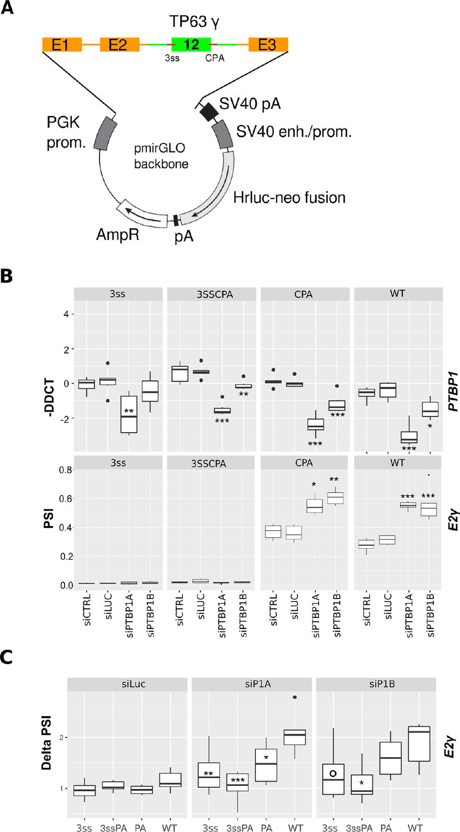 A TP63γ minigene recapitulates the PTBP1-dependent regulation of exon γ inclusion. A, Structure of the TP63 minigene stably transfected in HaCaT cells. β-globin gene sequences are shown in orange, TP63 gene sequences are shown in green. B, qRT-PCR quantification of PTBP1, and the RNA isoforms produced from the TP63 minigene after siRNA-mediated PTBP1 depletion. C, Delta PSI are computed as the fold difference between test and siCTRL as the reference condition. In all panels, n = 6; *, P < 0.05; **, P < 0.01; ***, P < 0.001; Dunnett test.
