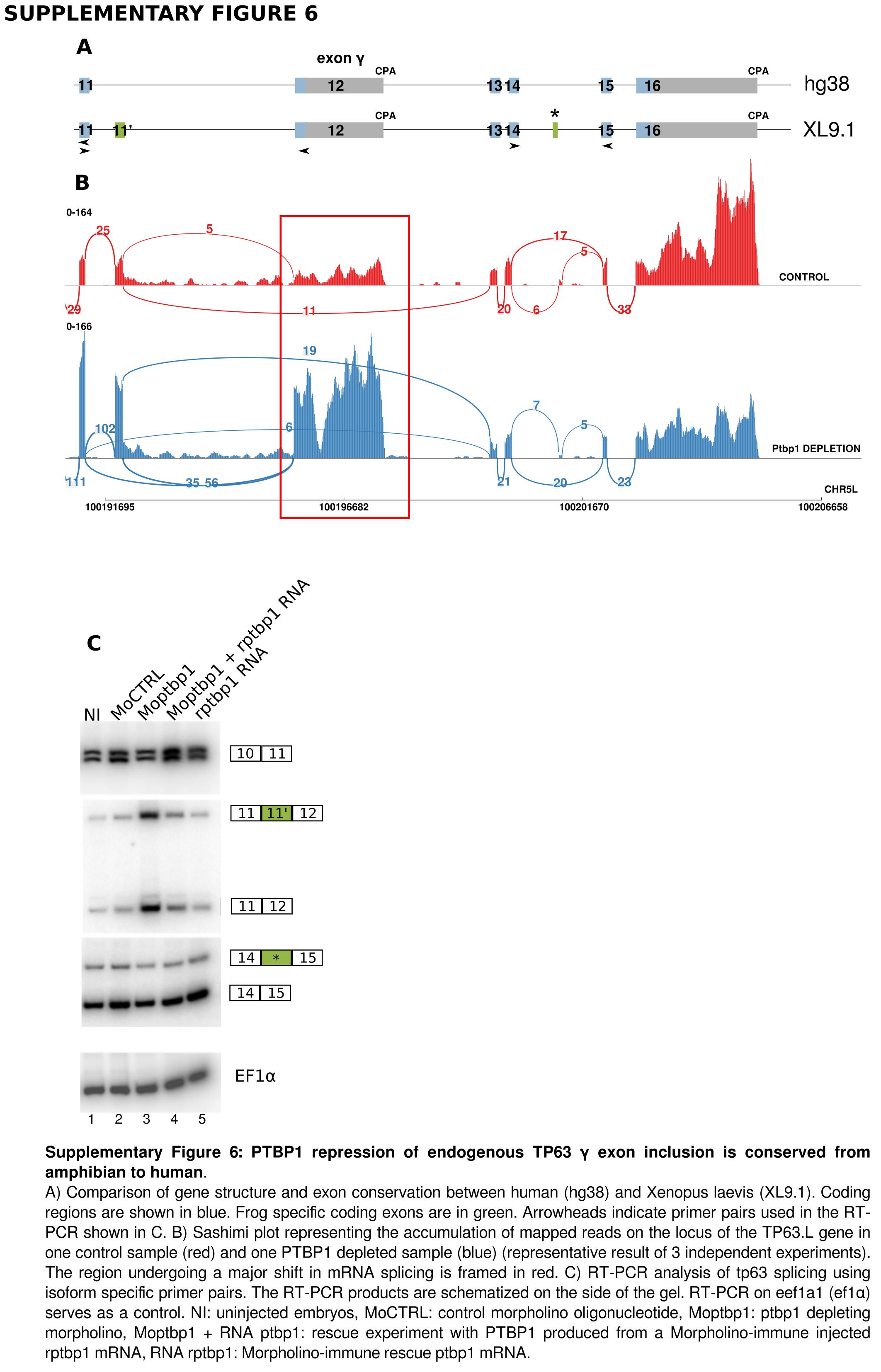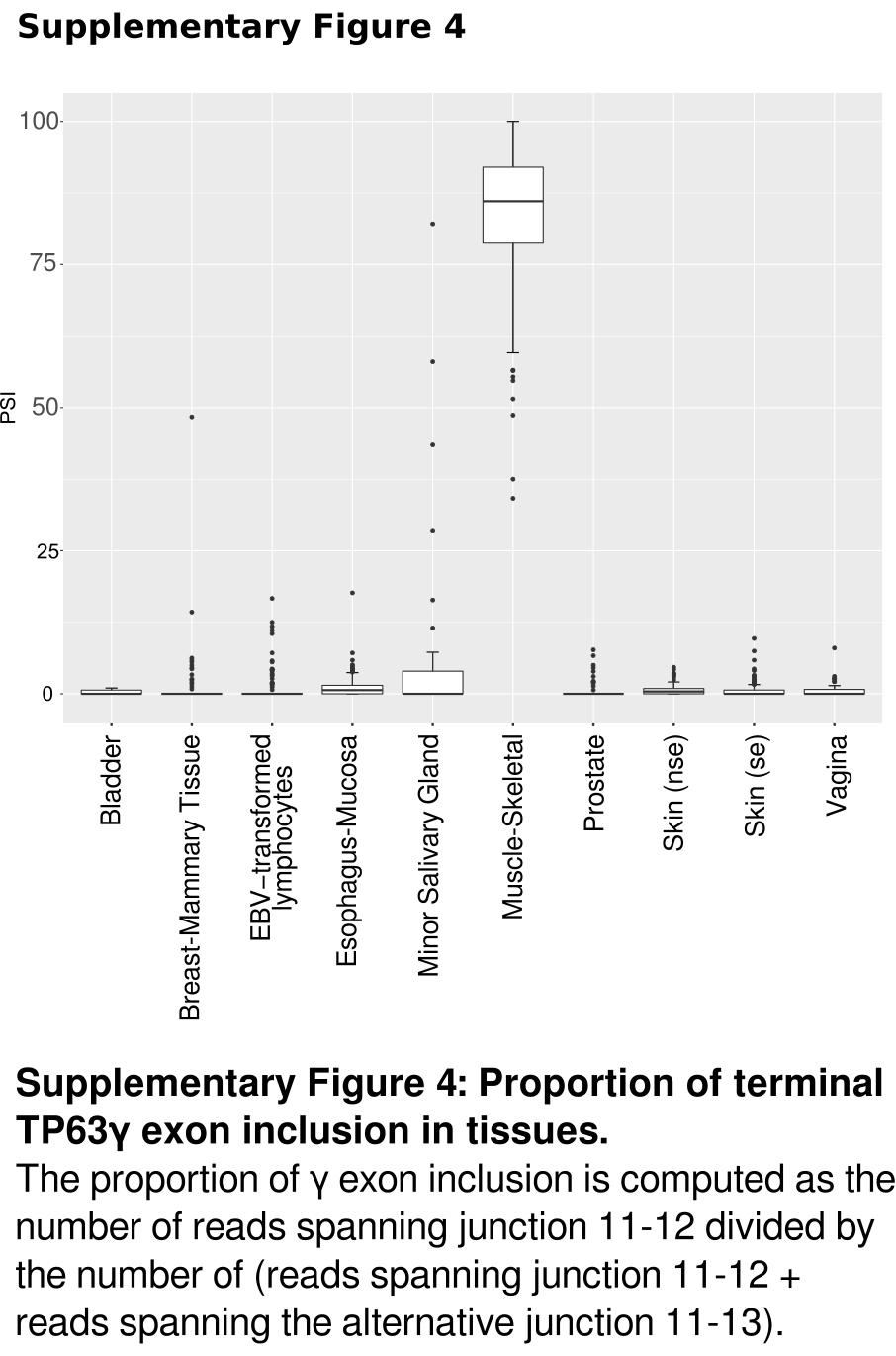 UNLABELLED: The TP63 gene encodes the p63 transcription factor. It is frequently amplified or overexpressed in squamous cell carcinomas. Owing to alternative splicing, p63 has multiple isoforms called α, β, γ, and δ. The regulatory functions of p63 are isoform specific. The α isoform inhibits the epithelial-to-mesenchymal transition (EMT) and controls apoptosis, while the γ isoform promotes EMT. Using The Cancer Genome Atlas data, we observed that a higher proportion of the TP63γ isoform is a detrimental factor for the survival of patients with head and neck squamous cell carcinoma (HNSCC) and is accompanied by the downregulation of desmosomal genes. By a correlation-based approach, we investigated the regulation of the production of the TP63γ isoform. According to our analysis of GTEx data, the expression of the RNA-binding protein PTBP1 (polypyrimidine tract binding protein 1) is negatively correlated with the abundance of TP63γ in several tissues. Accordingly, we demonstrated that PTBP1 depletion in HNSCC cell lines, keratinocyte or Xenopus embryos leads to an increase in TP63γ isoform abundance. By RNA immunoprecipitation and in vitro interaction assays, we showed that PTBP1 directly binds to TP63 pre-mRNA in close proximity to the TP63γ-specific exon. Intronic regions around the TP63γ-specific exon were sufficient to elicit a PTBP1-dependent regulation of alternative splicing in a splice reporter minigene assay. Together, these results identify TP63γ as an unfavorable prognostic marker in HNSCC, and identify PTBP1 as the first direct splicing regulator of TP63γ production and a potential route toward TP63 isoform control.
