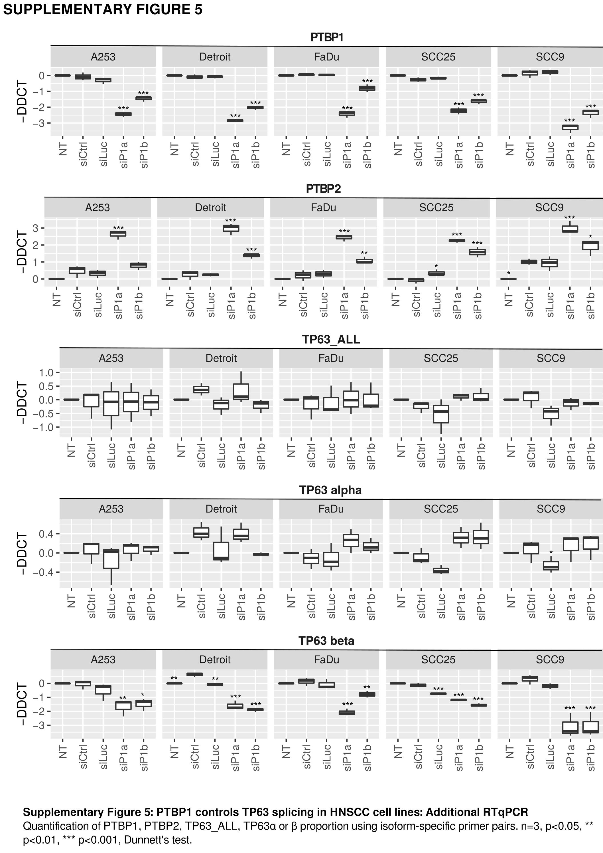 PTBP1 controls TP63 splicing in HNSCC cell lines. A, The abundance of p63 protein was evaluated in HaCaT, HeLa, and HNSCC cells by Western blot analysis and immunodetection using a pan-p63 antibody (4A4) or a p63α-specific antibody (D2K8X; representative results of three independent replicates). Even loading was controlled using proliferating cell nuclear antigen (PCNA) and β-tubulin antibodies as indicated. B, Total TP63 RNA was measured by qRT-PCR with one pair of primers detecting all isoforms. Quantification was normalized to a calibration curve obtained from TP63 plasmid DNA dilutions (n = 3). C, Quantification of TP63α, β, or γ proportions using isoform-specific primer pairs (n = 3). The amount of each isoform was normalized by the total abundance of TP63 mRNA as in B. D, Top, Evaluation of PTBP1 depletion by Western blot analysis, PCNA serves as a loading control. Remaining PTBP1 levels in the three independent experiments are presented below each panel. Bottom, Quantification of TP63γ isoform and PTBP1 RNA in control and PTBP1-depleted HNSCC cell lines (n = 3). *, P < 0.05; **, P < 0.01; ***, P < 0.001; Dunnett test.