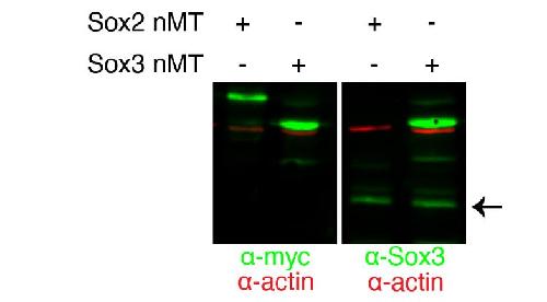 Fig. S1. Western blot of embryos at blastula stage expressing myc-tag Xenopus Sox2 or Sox3. Left blot is using the myc 9E10 monoclonal antibody (Green) and anti actin for loading control (Red). The right blot is performed using the anti Sox3 antibody (DA5H6sox3, Green). Note that the upper band corresponding to Sox2 is not recognized by mAb DA5H6sox3.
