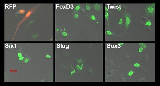 Figure 1. Immunofluorescence testing of serum. The serum from mouse M3 immunized with FoxD3-Flag, Twist-Flag, Six1-Flag, Slug-Flag and Sox3-Flag produced in Hek293T cells was tested by immunofluorescence on XTC cells transfected with each of the target or RFP-Flag as a negative control. A secondary Alexa 488-conjugated anti-mouse antibody was used to visualize the mouse primary antibodies (green). Notice the green nuclei in each of the transfections, with some non-transfected cells lacking signal.