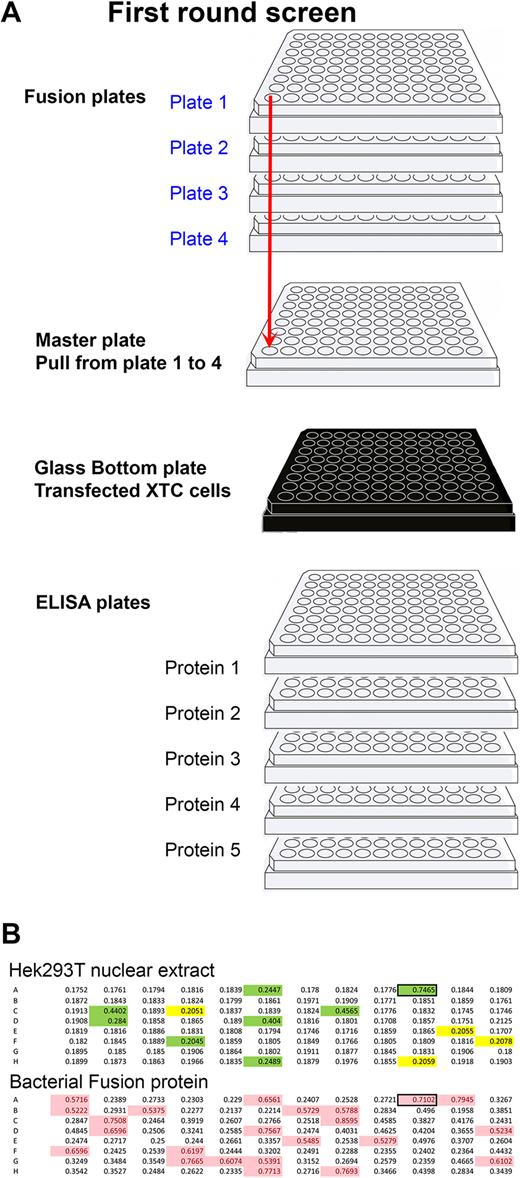 Figure 2. Primary screening method. (A) Diagram representing the strategy used to rapidly identify wells producing antibodies to multiple targets at once. Four plates per fusion were used. Thirty microlitres were taken from each well and placed in the master plate (total volume 120 µl). The master plate was diluted with 200 µl of TBST (TBS with 0.1% Tween 20). From the 320 µl of the master plate, 50 µl was added to each of the five ELISA plates plus the glass-bottom plate containing XTC cells transfected with each of the five targets. Simultaneously, 50 µl of supernatant was added to each well of five ELISA plates, each coated with individual proteins. Wells positive in either or both assays (A1 to H12) were then tested on each of the original plates (blue) to identify the plate number (deconvolution, 1A1 to 4H12). (B) Primary screen by ELISA using the cytoplasmic domain of Adam13/33 expressed in Hek293T cells (top) and his-tag bacterial fusion protein (bottom). The mice were immunized using the bacterial fusion protein. Highlighted wells are above the chosen background (0.2 for Hek293T and 0.5 for bacterial fusion protein). Wells highlighted in green are common to both ELISA and were selected for further screening.