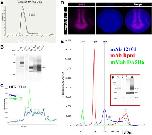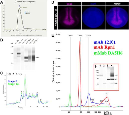 Figure 4. Secondary screening. (A) RNA-sequencing (RNA-Seq) expression data for Xenopus brachyury (tbxt) from Xenbase. No mRNA is detected for this gene at stage 1 (fertilized egg), but it is strongly expressed during gastrulation (stage 12). (B) Capillary western blot (0.04 embryo equivalent) at stage 1 and stage 12 for three independent hybridomas (8F8, 12H2, 5D11). Note that bands are visible only at stage 12. (C) Signal intensity of the chemiluminescence for clone 12H2 at stages 1 and 12. Note that a single peak is present in stage 12 (green), but not stage 1 (blue), but the background signal is similar. (D) Whole-mount immunofluorescence of a neurula stage embryo. Sox3 is in magenta, and DAPI (to stain nuclei) is in blue. MAb DA5H6sox3 detects the nuclei of cells within the neural plate. (E,F) Chemiluminescence signal (E) from a capillary western blot (F) of embryo extracts (0.04 embryo equivalent per lane) incubated with antibodies to Sox3 (green), Ribophorin1 (Rpn1, red) and the muscle marker 12101 (blue). Antibodies were incubated either separately (lanes 1-3) or together (lane 4).