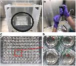 Figure 3. Manual clone picking. (A) Plates containing the hybridoma fusion were placed on a mirror to visualize large colonies. (B) Investigator pipetting a single colony guided by the mirror. (C) Photographs of the plate as seen in the mirror. (D) Higher magnification of four wells. Individual colonies are highlighted with red arrowheads.