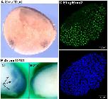 Figure 5. Immunostaining. (A) Whole-mount immunostaining using DA12H2xbra on bisected gastrula (Xbra/Tbxt). The dorsal side is to the left, and the animal pole is up. The antibody stains the nuclei in both the dorsal and ventral marginal zones (mesoderm). (B) Whole-mount immunostaining using a monoclonal antibody to Adam13/33 (DA8E6adam13) on embryos injected at the two-cell stage with a morpholino that blocks translation of Adam13. The cranial neural crest cells (black arrows) are visible on the non-injected (NI) side, but are absent on the injected side (MO13). (C) Immunofluorescence of a cranial neural crest explant using mAb DA1A8slug (green) and counterstained with DAPI (blue). Note that most of the nuclei are stained for Slug/Snai2 except for a small section on the left of the explant (dorsal) that is likely to be composed of neural plate cells