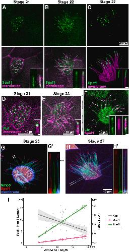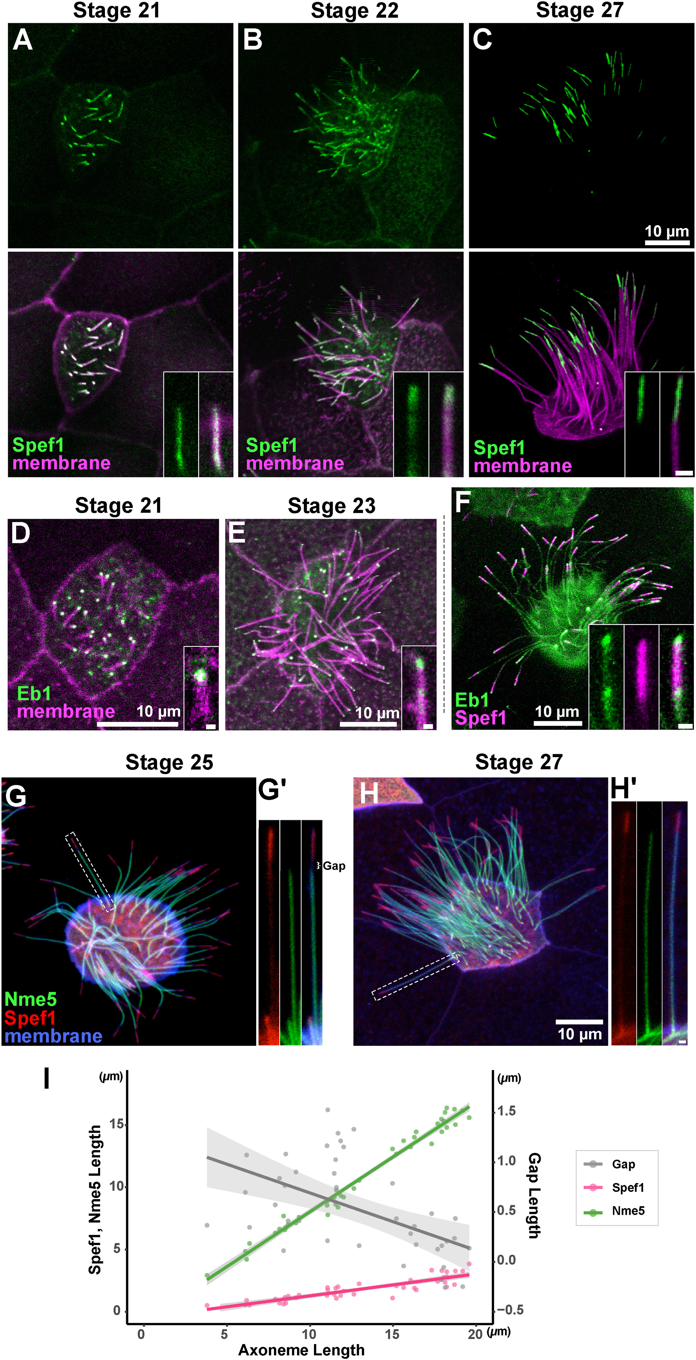 Fig. 2. A-C) GFP-Spef1 distal enrichment in growing axonemes at stages indicated. D-E) Eb1-GFP is enriched at the distal tip of growing axonemes at stages indicated. F) Image labeled Eb1-GFP and RFP-Spef1 G-H) The deployment of the radial spoke protein Nme5 does not reach to the Spef1-enriched domain at st. 25 but does so by st. 27. I) Plot of axoneme length versus Spef1 length, Nme5 length and the length of the gap separating them; each point represents a single axoneme. Scale bars = 10 m, scale bars for insets = 0.5 m.