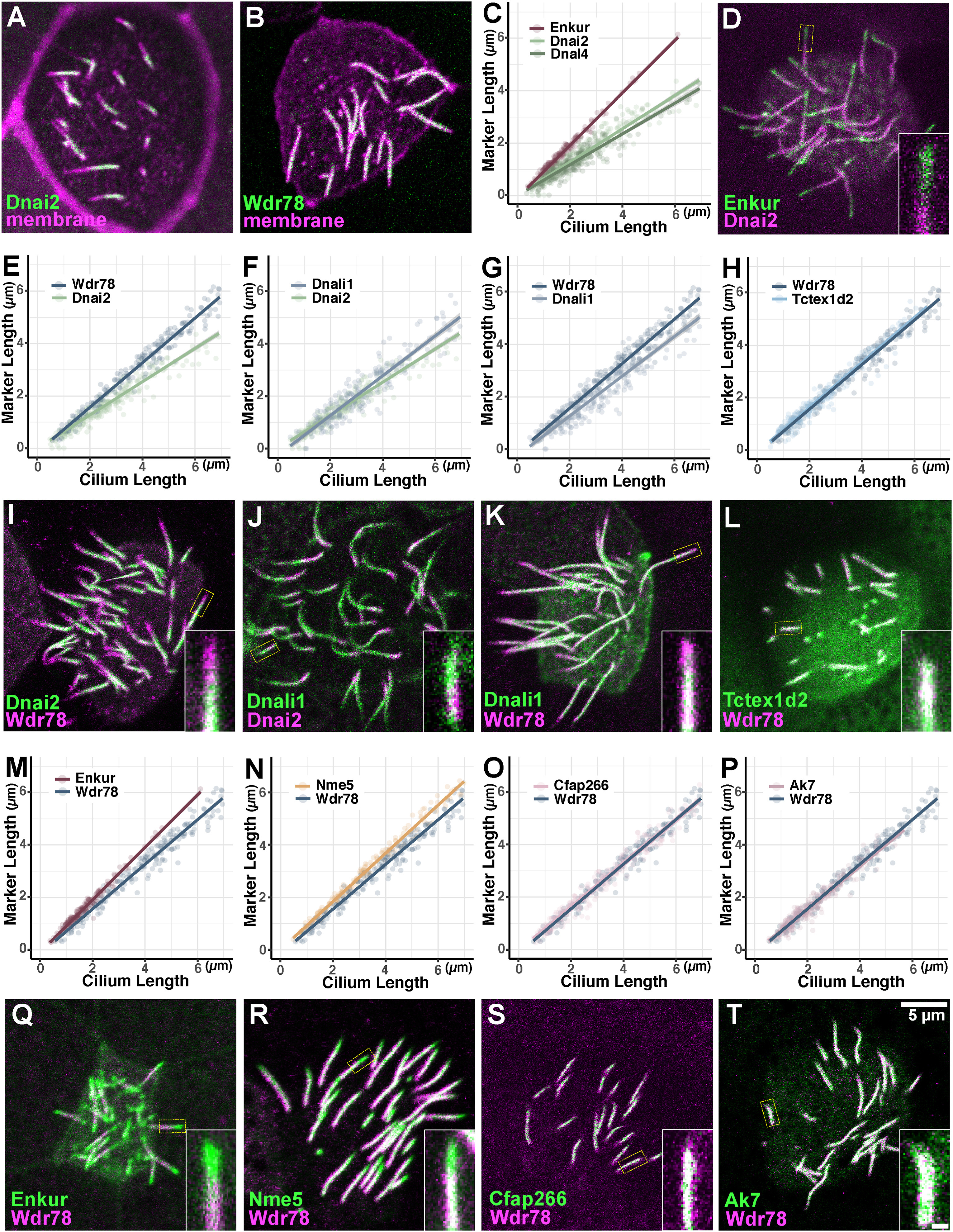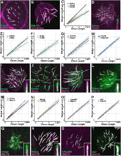 Fig. 4. A, B) Dnai2 and Wdr78 are clearly absent from the distal region of immature axonemes. C) ODA subunits display far slower deployment kinetics as compared to the MIP, Enkur. D) Dual labeling reveals that Enkur consistently extends distally to Dnai2 in growing axonemes, consistent with their distinct kinetics in C. E-H) IDAs display faster deployment kinetics than ODAs, and IDA sub-types display distinct kinetics. I-L) Dual labeling confirms relative rates of deployment for ODA/IDA subunits. M-P) IDAs deploy at rates slower than MIPs and radial spokes, and similar to the central apparatus. Q-T) Dual labeling confirms kinetic data on rates of IDA deployment. Note that data for Wdr78 and Dnai2 are re-plotted in multiple panels to facilitate comparison. Numbers of tested axonemes, cells and embryos for each protein are provided in the materials and methods. Scale bar = 5 μm, scale bar for insets = 0.5 μm.