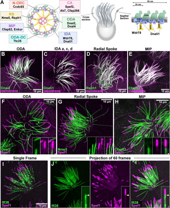 Fig. 1. A) Schematics of a representative vertebrate MCC axoneme (Lin et al., 2014), with relevant components of ciliary beating machineries indicated. ODA (outer dynein arm), IDA (inner dynein arm), CA (central apparatus), N-DRC (nexin-dynein regulatory complex), RS (radial spoke), MIP (microtubule inner protein), ODA-DC (ODA docking complex) B-E) The indicated ODAs, IDAs, radial spokes, and MIPs do not extend to the distal limit of the axoneme, as marked by membrane RFP. FH) The indicated ODA, radial spoke, and MIP are excluded from the Spef1-enriched distal domain. I) A single frame from a time-lapse movie of GFP-Ift38 and RFP-Spef1. J) A projection of 60 frames of time-lapse data reveals absence of Ift38 from the Spef1-enrched distal domain at st. 27. Scale bars = 10 m, scale bars for insets = 0.5 m.