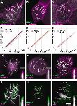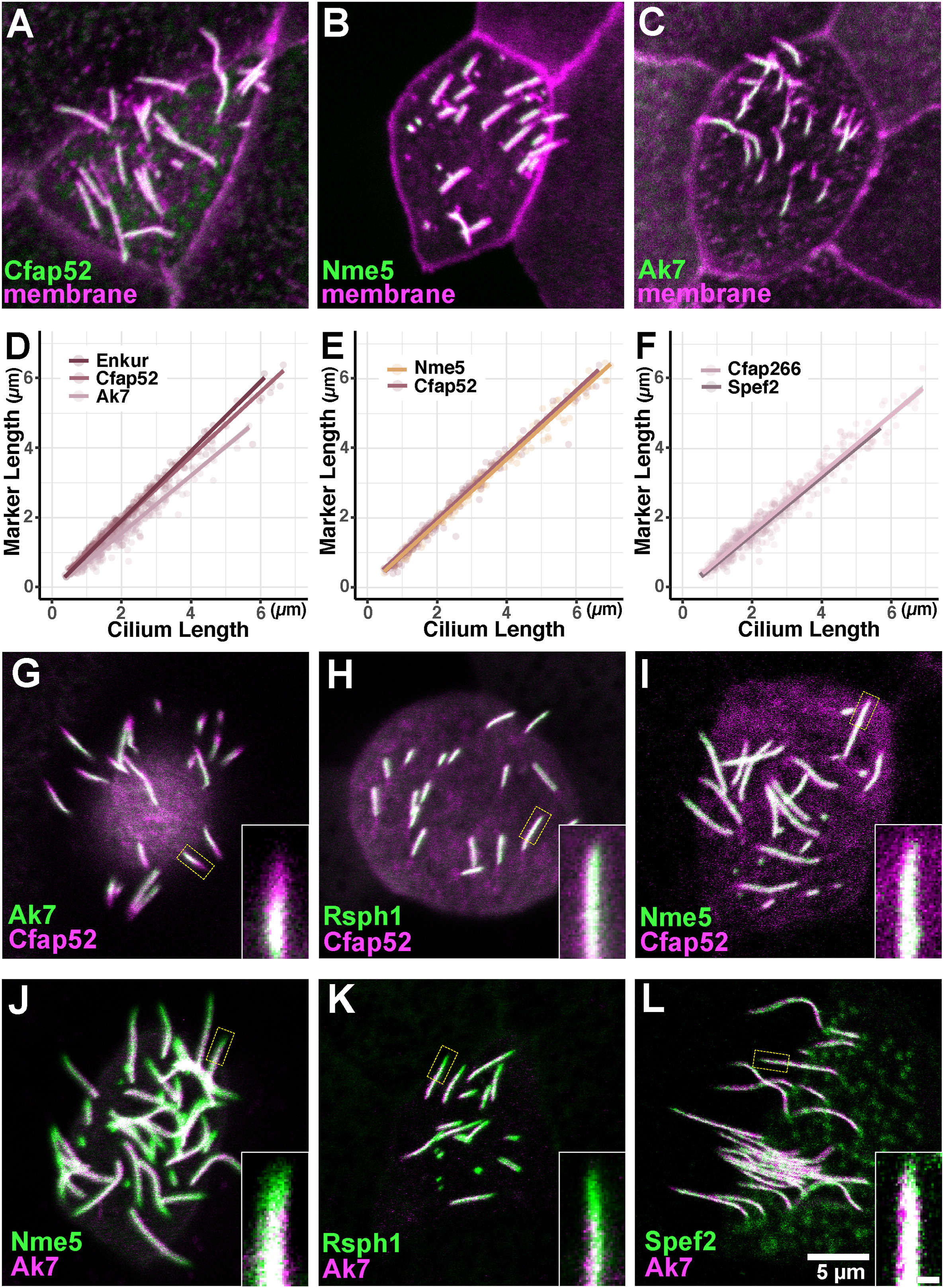 Fig. 3. A-C) Ciliary proteins fused to GFP displayed with memRFP visualizing the entire axoneme in growing axoneme. D-F) Plots of total axoneme length versus the length of the axoneme decorated by the labeled protein. Note that Cfap52 is re-plotted in the two panels to facilitate comparison. G-L) Double labeling confirms that radial spoke protiens (Nme5, Rsph1) do not display consistent differences from Cfap52, while the central apparatus proteins (Ak7, Spef2) displayed distinct kinetics, lagging behind Cfap52, Nme5 and Rsph1. Numbers of tested axonemes, cells and embryos for each protein are provided in the materials and methods. Scale bar = 5 μm, scale bar for insets = 0.5 μm.