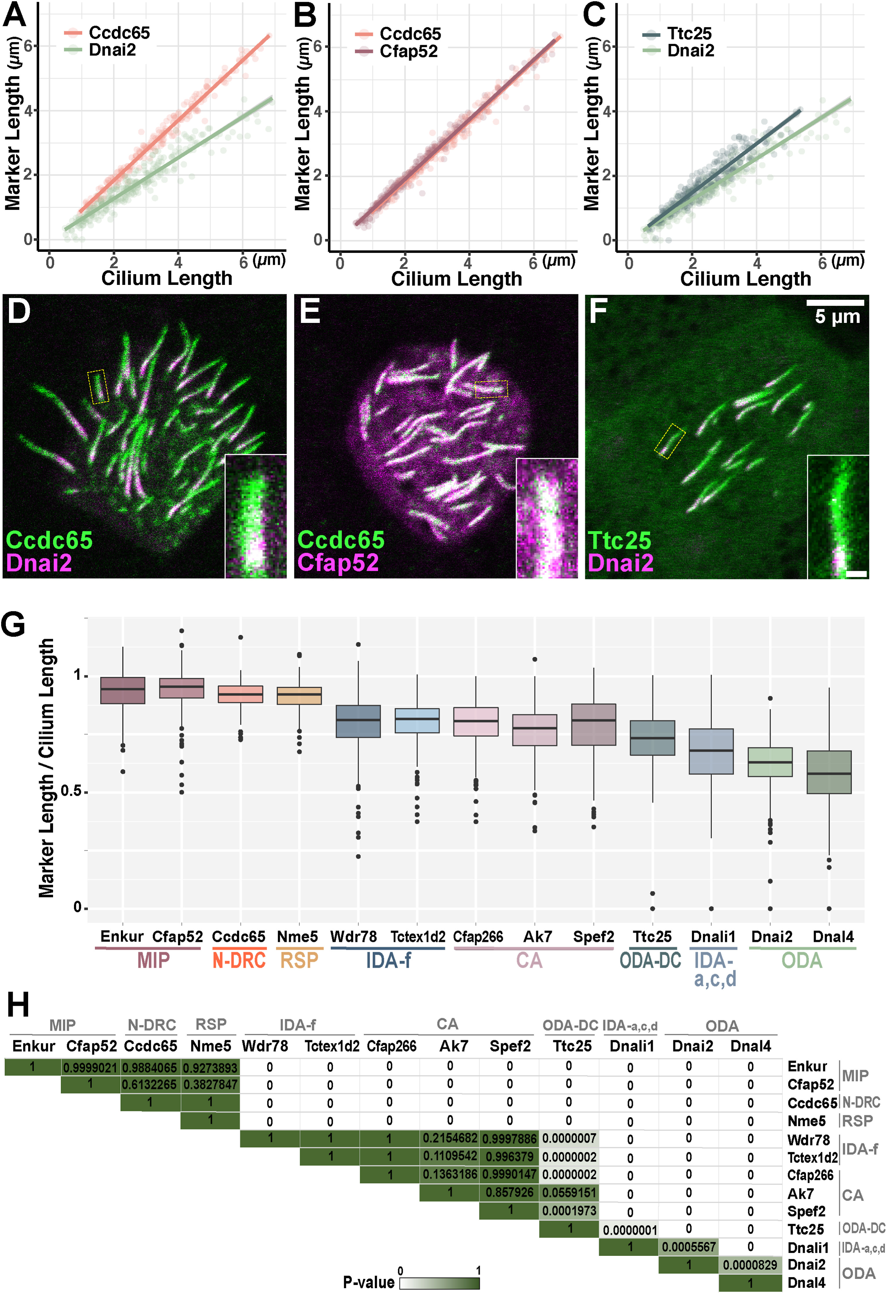Fig. 5. A-C) Additional elements of ciliary beating machineries display unexpected kinetics, and dual labeling confirms these relative rates (D–F). Note that data for Ccdc65 and Dnai2 are re-plotted in multiple panels to facilitate comparison. G) Summary of ciliary beating machinery deployment kinetics. Graph shows the mean ratio of decorated axoneme length versus total axoneme length for each protein. H) Heatmap with adjusted p-values representing all pairwise comparisons. Significant differences are indicated in white, and no difference is indicated in dark green. Numbers of tested axonemes, cells and embryos for each protein are provided in the materials and methods. Scale bar = 5 μm, scale bar for insets = 0.5 μm.