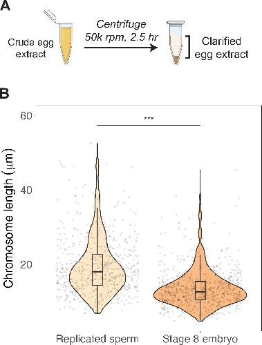Figure 3—figure supplement 1. Clarified egg extracts support mitotic chromosome scaling.(A) Crude extracts were centrifuged at high speed to pellet membranes. (B) Quantification of mitotic chromosome lengths from either replicated sperm nuclei or stage 8 embryo nuclei added to clarified metaphase egg extracts. n = 3 biological replicates, >50 chromosomes per replicate. ***p<0.001 by the Mann–Whitney U test. Source data are available in Figure 3—source data 1. |