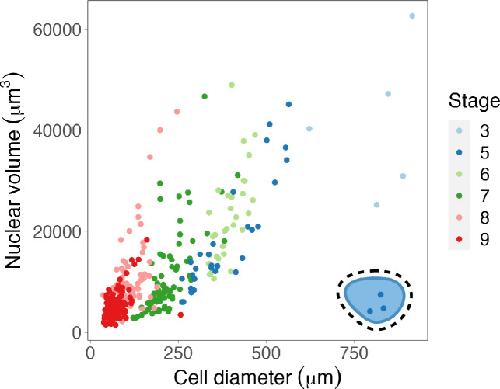 Figure 1—figure supplement 3 Nuclear volumes scale continuously with cell size. Nuclear volumes plotted against cell diameter. Raw data used with permission from Jevtić and Levy, 2015. Source data are available in Figure 1—source data 1. |