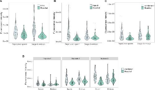 Figure 3—figure supplement 3. Raw fluorescence intensities for embryo vs. sperm immunofluorescence.(A–C) Background-subtracted fluorescence intensities for data presented in Figure 3D, with protein of interest and Hoechst signals plotted separately. n = 3 biological replicates, >50 chromosomes per replicate. (D) Raw intensities for three biological replicates of condensin I immunofluorescence experiment. Source data are available in Figure 3—source data 1. |