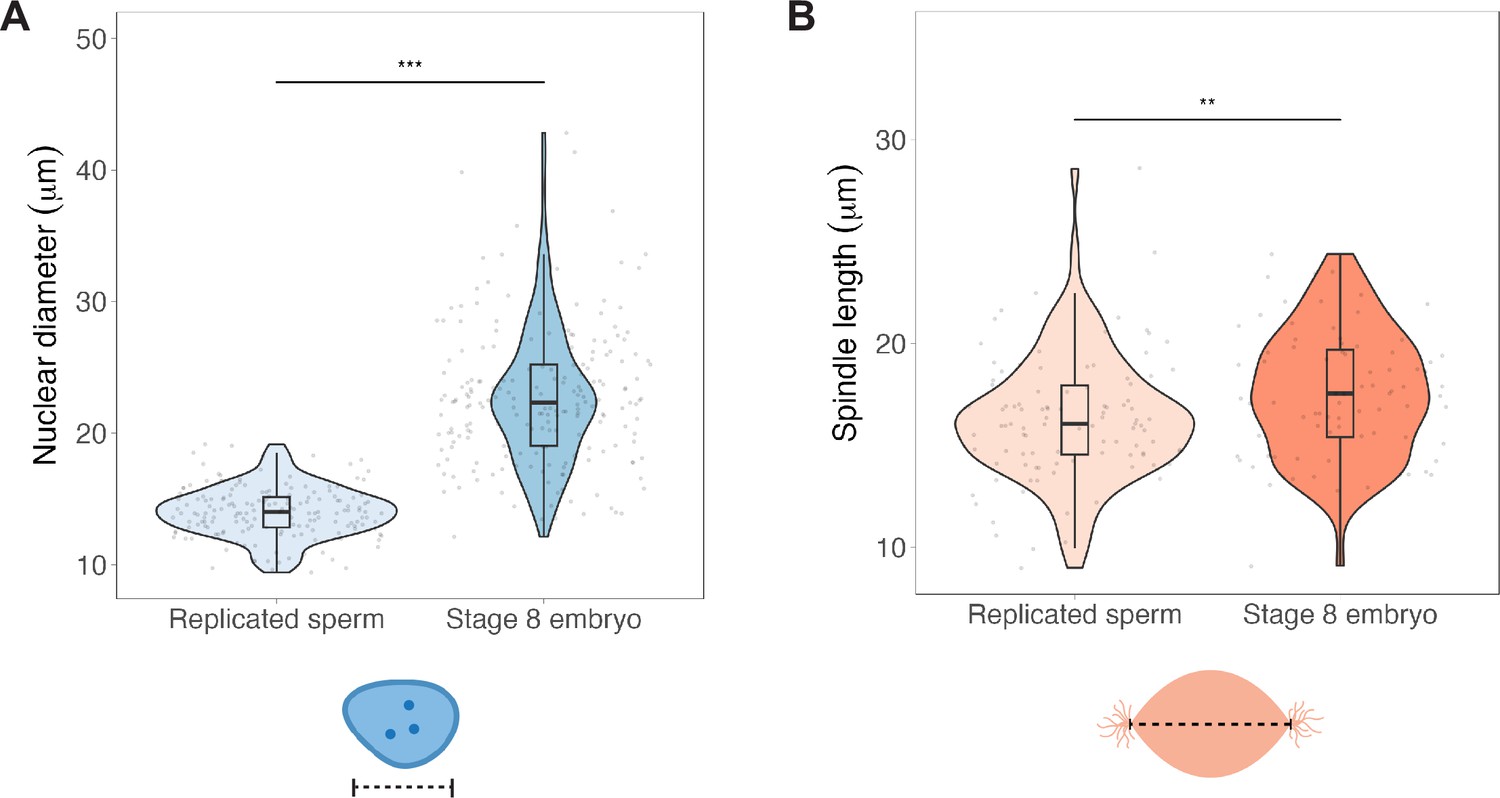 Figure 3—figure supplement 2 Nuclei and spindles do not scale with mitotic chromosome size in egg extracts. (A) Diameters of replicated sperm nuclei or stage 8 embryo nuclei measured just before addition to metaphase egg extracts. (B) Lengths of spindles formed around either replicated sperm nuclei or embryo nuclei in metaphase egg extracts. n = 3 biological replicates, >25 structures per replicate. ***p<0.001, **p=0.004 by the Mann–Whitney U test. Source data are available in Figure 3—source data 1. |