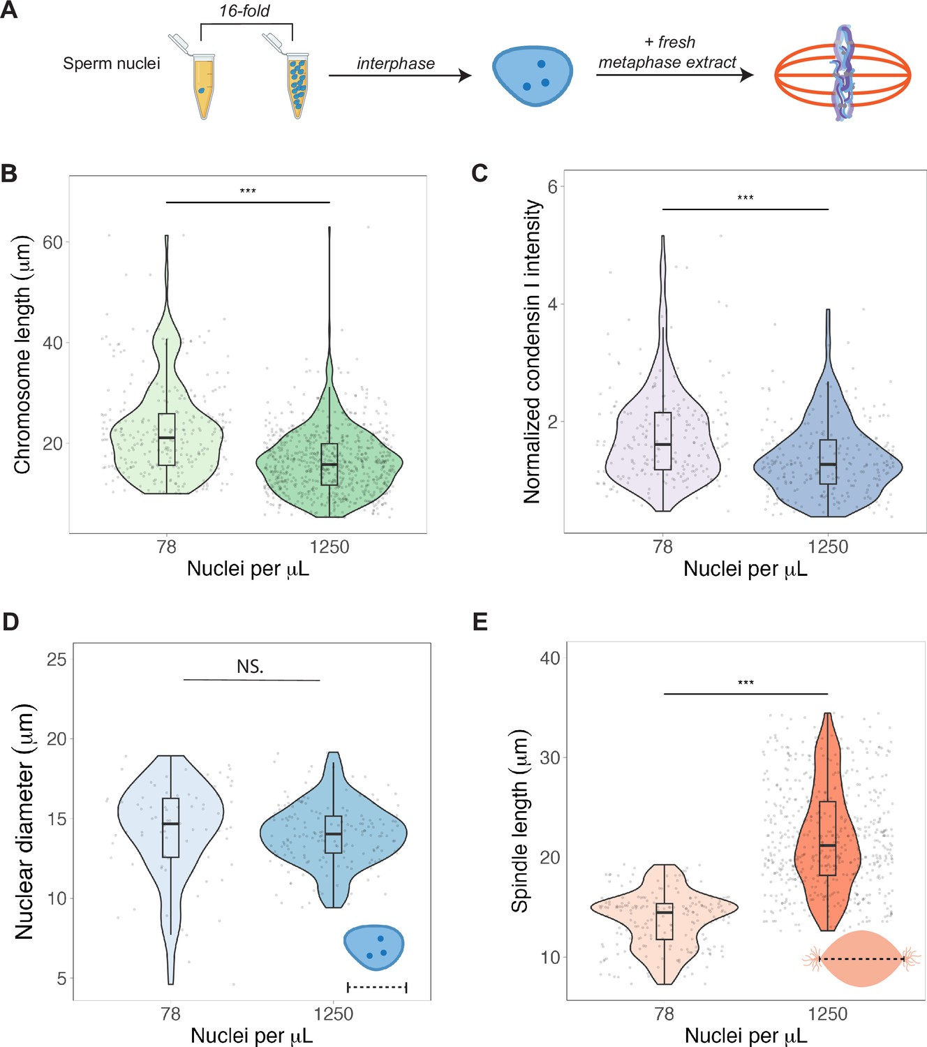 Figure 5 with 4 supplements Nuclear-cytoplasmic ratio regulates mitotic chromosome scaling, but not nuclear or spindle scaling. (A) Concentration of sperm nuclei in egg extracts was varied 16-fold to mimic concentrations found in early (78 nuclei/μL) vs. late (1250 nuclei/μL) blastula stages. (B) Quantification of mitotic chromosome lengths and (C) condensin I abundance in extracts containing high or low concentrations of sperm nuclei (difference in median intensity is 1.6-fold). (D) Nuclear diameters for samples containing low or high concentrations of sperm nuclei. (E) Spindle lengths for samples containing low or high concentrations of sperm nuclei. n = 3 biological replicates, >50 structures per replicate, ***p<0.001 by the Mann–Whitney U test. NS denotes p=0.09. Source data are available in Figure 5—source data 1. |