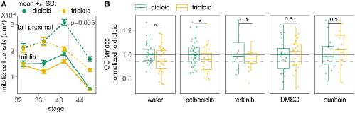 Figure 4. The energetic cost of cell membrane maintenance, not proliferation, accounts for the difference in metabolism between diploids and triploids (A) Mitotic cell density in the tails of diploid and triploid embryos assessed by quantifying phospho-histone H3-positive cells (n = 3, 5–6 embryos per clutch). (B) OCR per mass normalized to the median diploid value for each condition in stage 41 tadpoles during a 6-h incubation in water, 6 μg/mL palbociclib, 12.5 nmol/mL torkinib, 0.1% DMSO, or 200 μg/mL ouabain. Results are shown for 3–4 mg embryos except 5–6 mg for ouabain (n = 3–5 clutches per condition; details in Table S4). Dashed line indicates the average in untreated triploids. Welch two-sample t test comparing the means, ∗p < 0.5, ∗∗p < 0.01, ∗∗∗p < 0.001. See also Figure S4. |