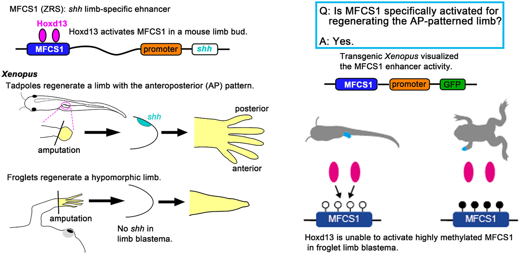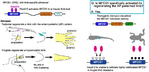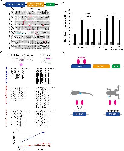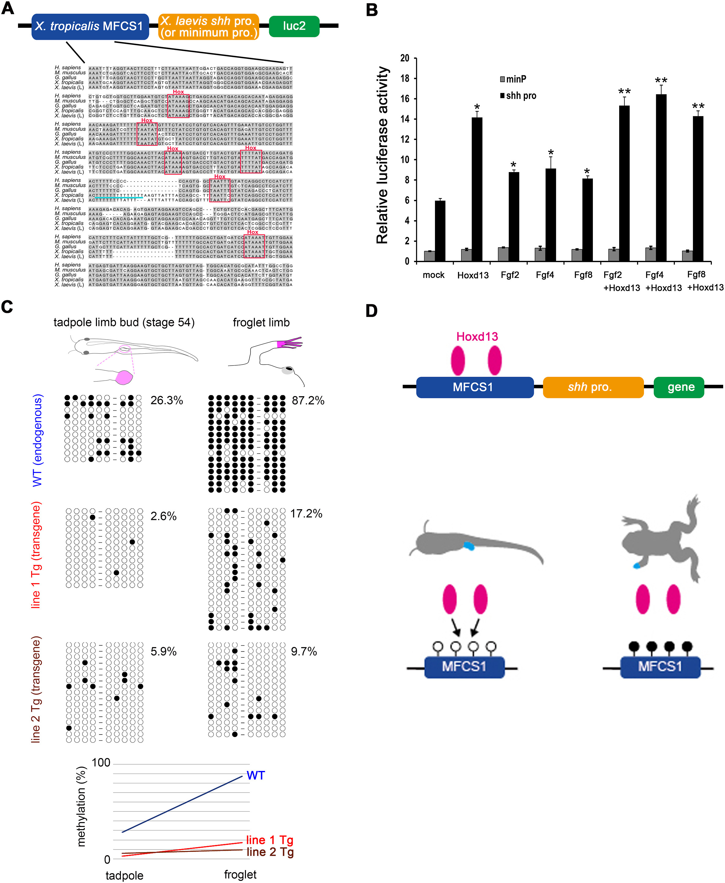 Fig. 4. Transactivation and DNA methylation of Xenopus MFCS1 enhancer. (A) Upper: Map of MFCS1-luc2 for assays in (B). Lower: Alignment of MFCS1 highly conserved sequences. Nucleotides identical in more than two sequences are shaded. Conserved Hox-binding motifs are boxed. A light bule line underlies the 14-thymidine repeat. (B) Normalized luciferase activity. Error bars, standard deviation from the mean (n = 3). ∗Significant increase from mock (p<0.01). ∗∗Significant increase in Fgf2+Hoxd13, Fgf4+Hoxd13 and Fgf8+Hoxd13 from sole Fgf2, Fgf4 and Fgf8, respectively (p<0.01). (C) Methylation pattern of endogenous and transgene MFCS1 (line 1 and line 2). Samples were obtained from the autopod (pink). Circles correspond to nine CpG sites (Fig. S6). Lower: Increases in average methylation rate of the MFCS1 after metamorphosis. (D) Model for epigenetic silencing of gene expression. Hoxd13 activates hypomethylated MFCS1 and results in transcription of a gene (left). However, Hoxd13 is unable to activate highly methylated MFCS1 and results in inactive transcription (right).
