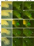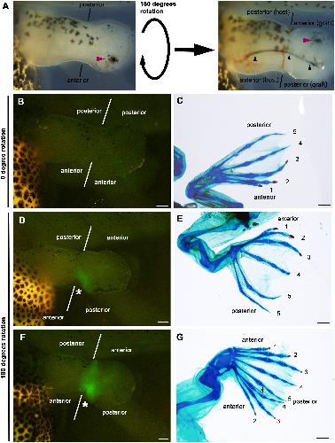 Fig. 2. MFCS1-GFP expression precedes limb duplication along the AP axis in 180° rotated limb buds. (A) 180° rotation of a limb bud at stage 53. A magenta arrowhead, a Nile blue particle: Black arrowheads, a tungsten pin. (B, C) A 0° rotated limb bud at 6 days after grafting (B) and the resultant normal limb formation (C). (D–G) 180° rotated limb buds. Rotated limb buds at 6 days after grafting (D,F) resulted in supernumerary limb formation (E,G). A pair of lines, the host-graft boundary: An asterisk, ectopic GFP: An Arabic number, the digit identity: A black arrow, an unidentifiable digit. Bars = 200 μm for (B, D, F) and 1 mm for (C, E, F).