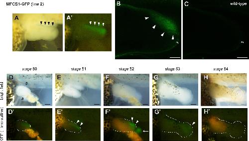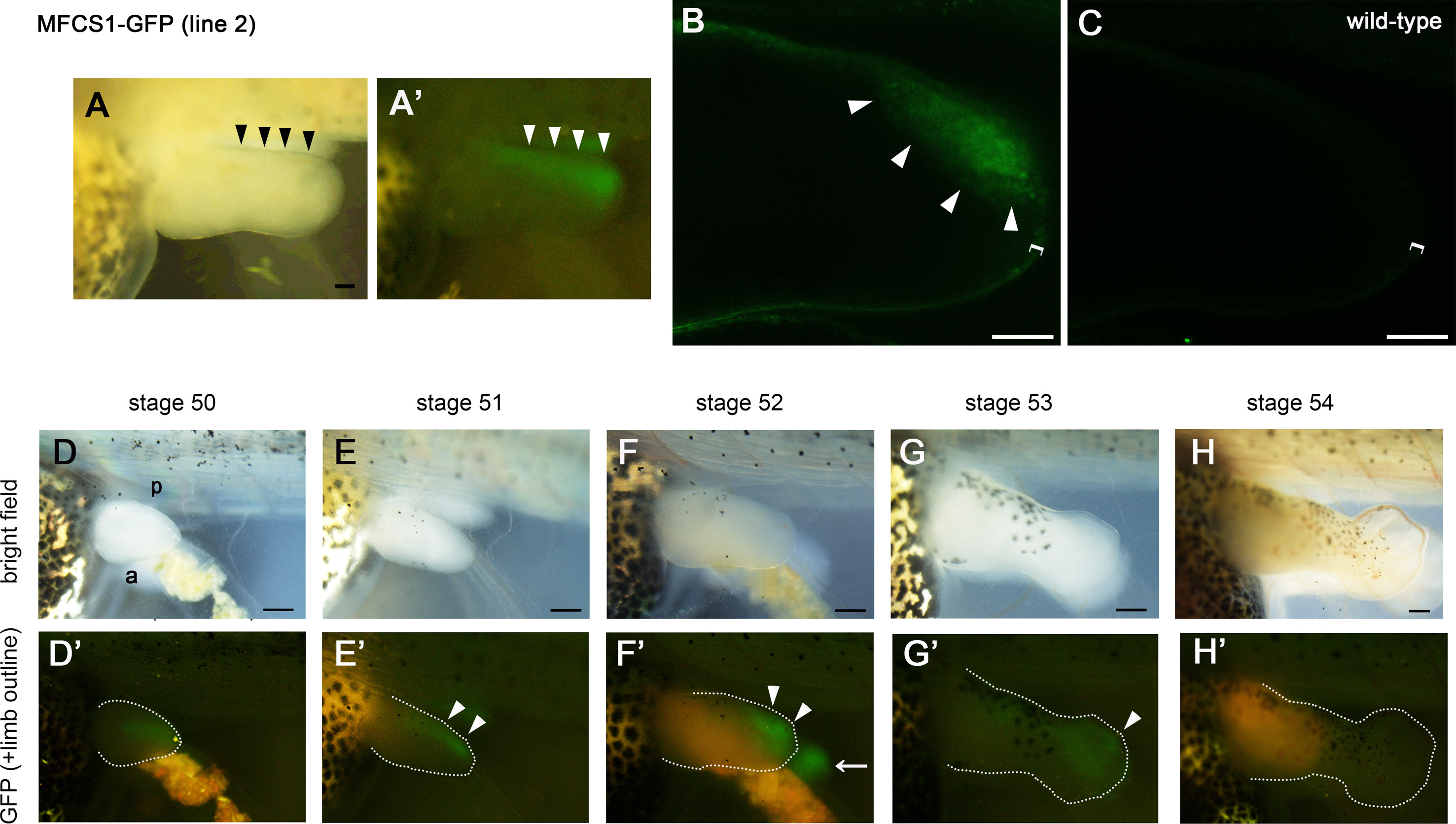 Fig. S1. MFCS1-GFP expression pattern was recapitulated in line 2. (A) A developing limb bud of an MFCS1-GFP Tg tadpole of line 2 at stage 52. Bright-field (A) and fluorescent (A’) images of the same limb bud. (B, C) Optical-section images by confocal microscopy of the limb bud of an MFCS1-GFP Tg tadpole of line 2 (B) and a wild-type tadpole (C) at stage 52. GFP expression was detected in the posterior side mesenchyme specifically in the MFCS1-GFP Tg tadpole. Bright field (D-H) and fluorescent (D’-H’) images of the limb bud of the same Tg tadpole of line 2. Limb buds are outlined by dotted lines. GFP expression was detected in the posterior side of limb buds at stage 51–52 and then gradually diminished. a, anterior: p, posterior. Arrowheads, GFP expression (A, A’, B, E’, F’, G’) at the posterior side of the limb buds: Arrow, GFP fluorescence of the contralateral right limb bud: Bracket, the epidermal cell layer. Bars = 100 μm for (A, B, C), 200 μm for (D-H, D’-H’).