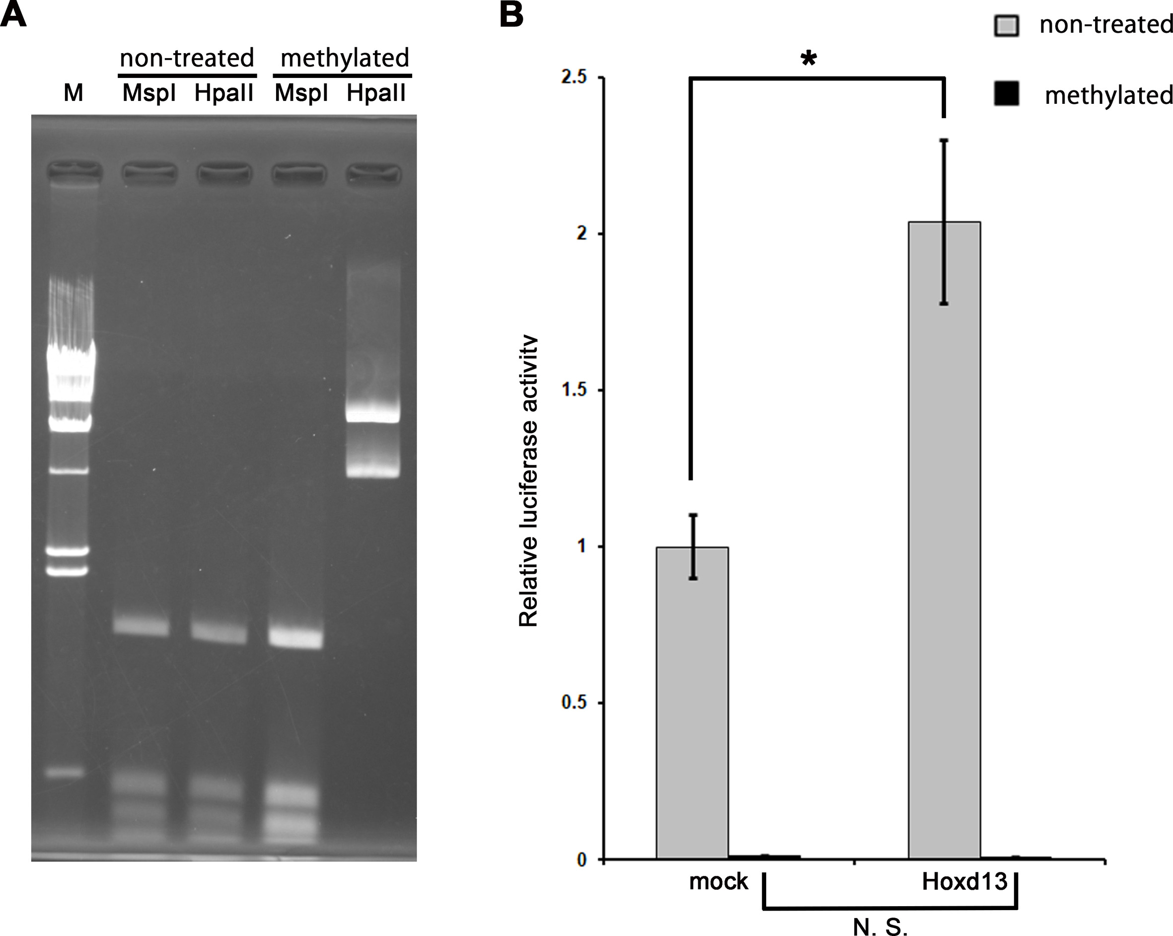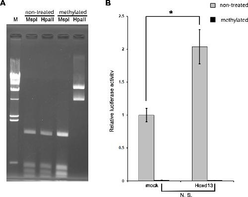 Fig. S5. DNA methylation suppresses the response of MFCS1 to Hoxd13 in vitro. (A) Methylation-sensitive restriction digestion visualized by agarose gel electrophoresis. Plasmid DNA of the MFCS1-shh promoter-luc2 reporter was treated with CpG methyltransferase (M. SssI, NEB) according to the manufacturer’s protocol. Methylation efficiency of the plasmid DNA was evaluated by digestion with methylation-sensitive (HpaII) and -insensitive (MspI) restriction enzymes. The CpG methylation prohibited the digestion of the plasmid DNA specifically with HpaII. M, λ/HindIII marker. (B) Luciferase activity in NIH3T3 cells transfected with the methylated or non-treated MFCS1-luc2 reporter constructs and the Hoxd13 expression construct. The mean value of luciferase activity in cells transfected with the non-treated reporter and mock expression constructs was set to 1.0. Error bars: standard deviation from the mean (n = 3). While a significant increase of Hoxd13-induced luciferase activity was observed in cells transfected with the unmethylated reporter construct (∗p<0.01), being consistent with Fig. 4B, there was no significant increase in cells transfected with the methylated reporter construct despite Hoxd13 expression. N. S., not significant.