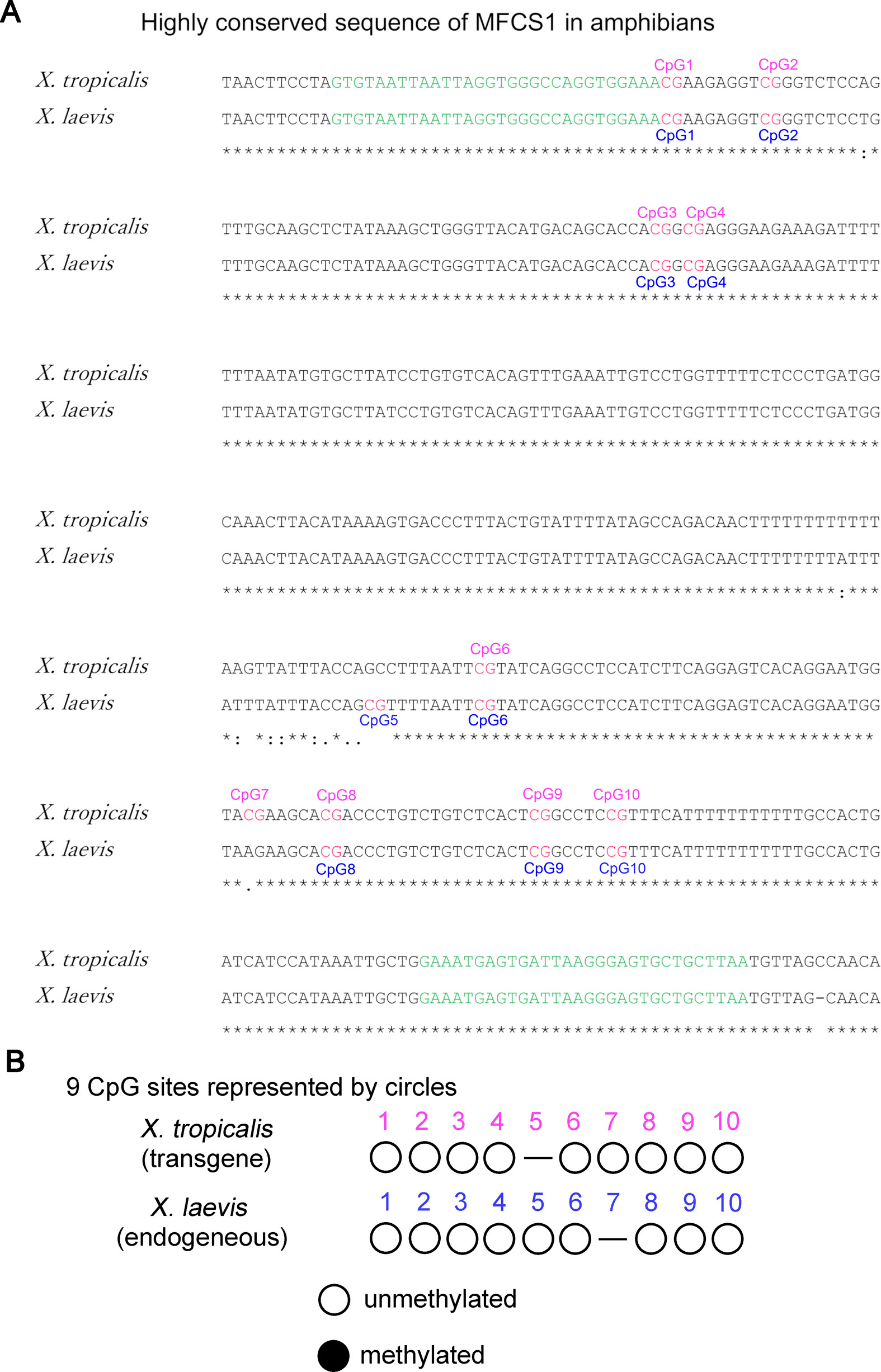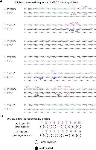 Fig. S6. X. tropicalis and X. laevis have 9 CpG sites in the highly conserved sequence of MFCS1. (A) Alignment of MFCS1 highly conserved sequences between X. tropicalis and X. laevis. Green letters correspond to MFCS1_BS_Fw and MFCS1_BS_Rv primers for bisulfite sequencing (see also Table S3). (B) Open and black circles represent unmethylated and methylated CpG sites, respectively.