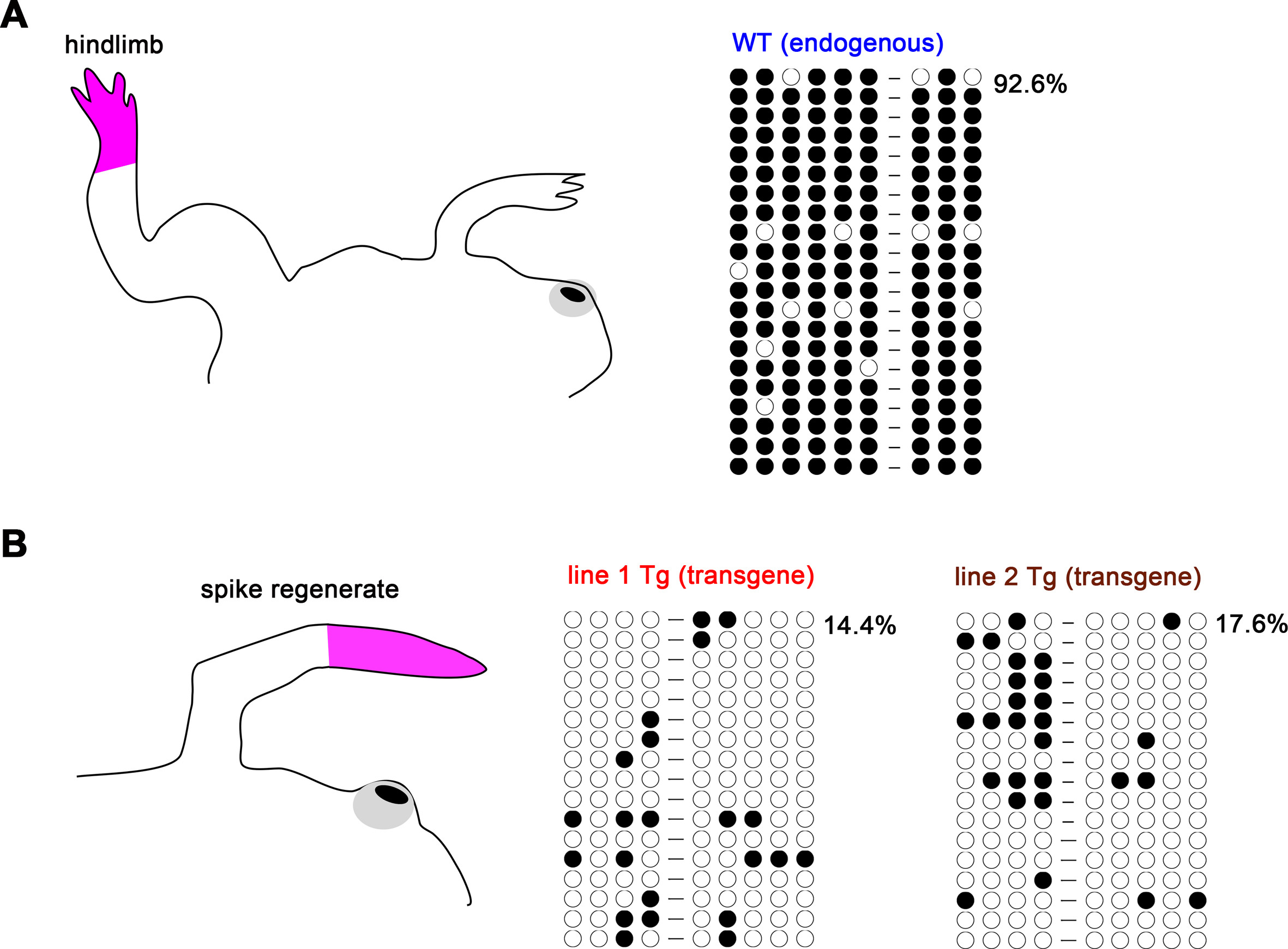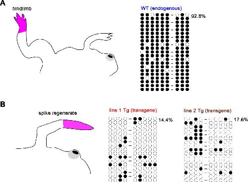 Fig. S7. Methylation pattern of MFCS1 in a hindlimb and a spike regenerate. (A) Hindlimb samples were obtained from the autopod (pink) of wild-type froglets. (B) After limb blastemas of froglets completed spike regeneration, regenerate samples (pink) were obtained from line 1 and line 2 Tg frogs.