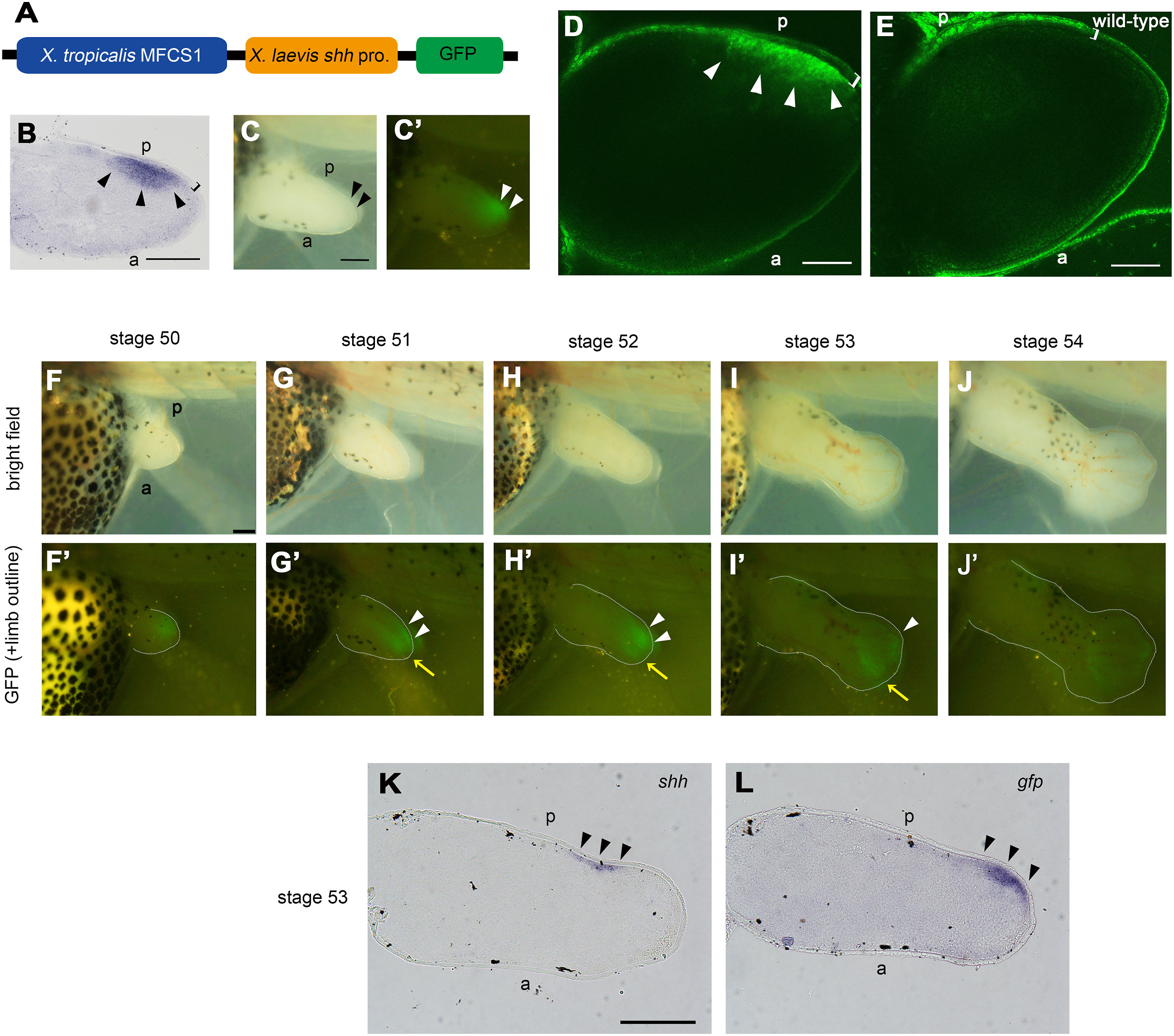 Fig. 1. MFCS1-GFP expression coincides with shh expression in a developing limb bud. (A) The MFCS1-GFP transgene. (B) shh expression at stage 52. (C, C’) A limb bud of an MFCS1-GFP tadpole at stage 51. Bright-field (C) and fluorescent (C’) images. (D, E) Optical-section images by confocal microscopy of the limb bud of an MFCS1-GFP (D) and that of a wild-type tadpole at stage 51. Bright-field (F–J) and fluorescent (F’-J’) images of the limb bud of the same MFCS1-GFP tadpole. Limb buds are outlined by dotted lines in the fluorescent images. (K, L) shh and gfp expression in adjacent sections of the MFCS1-GFP tadpole at stage 53. All of the MFCS1-GFP tadpoles shown are line 1. a, anterior: p, posterior. Arrowheads, shh (B, K), gfp (L) or GFP expression (D, E, G’, H’, I’) at the posterior side: Yellow arrows, GFP at the central region: Bracket, the epidermal cell layer. Bars = 100 μm for (B, D,E) and 200 μm for (C, C’, F-L, F’-J’).