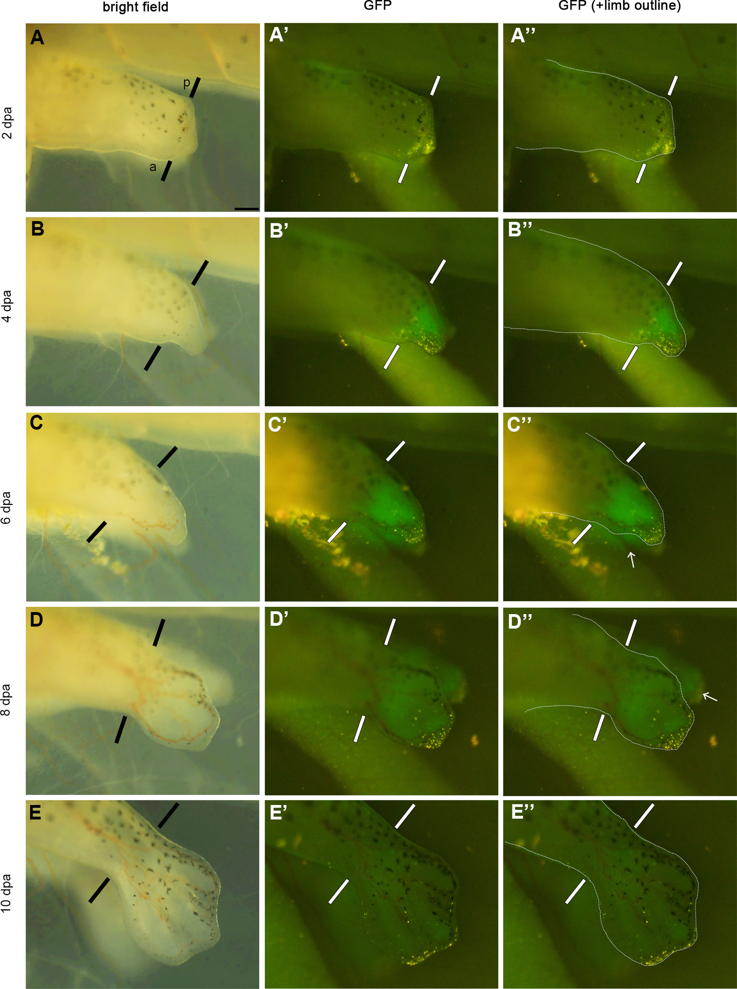 Fig. S2. Spatio-temporal expression pattern of MFCS1-GFP in a regenerating limb of a young tadpole. All of the pictures are focused on a limb blastema of the same tadpole (identical to Fig. 3Q-T) of line 1. Left and right limb buds were amputated at the presumptive ankle level of a stage 54 tadpole. GFP fluorescence was distributed throughout the regenerating limb blastema at 4 dpa and 6 dpa. (A’’, B’’, C’’, D’’, E’’’) Limb blastemas and stumps are outlined by dotted lines. n = 16 of 16 blastemas from a total of ten MFCS1-GFP tadpoles of line 1 and 6 of 6 blastemas from a total of three MFCS1-GFP tadpoles of line 2, respectively. A pair of lines, the amputation level: Arrows, GFP fluorescence of the contralateral right limb blastemas: a, anterior: p, posterior. Bar = 200 μm.