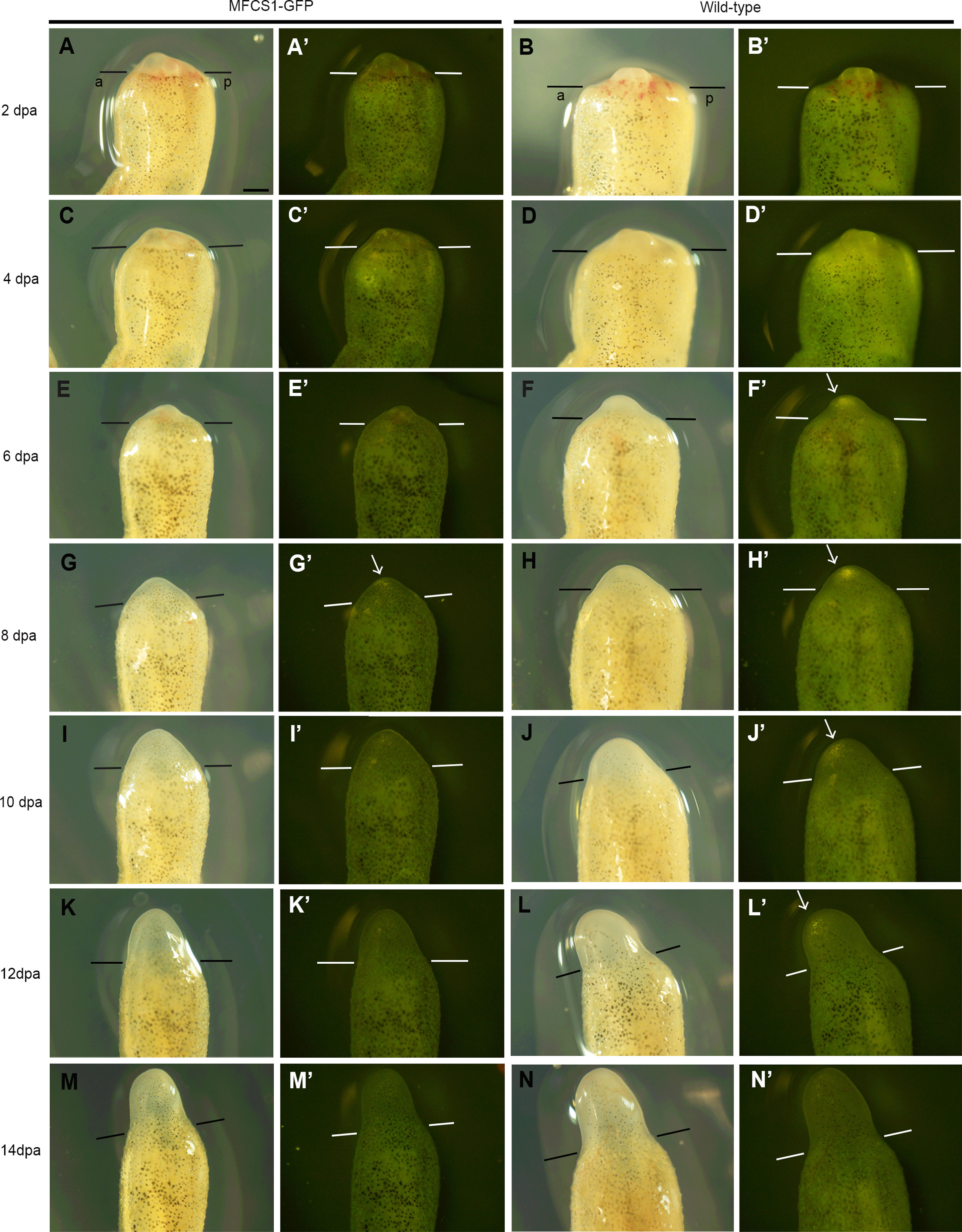 Fig. S3. MFCS1-GFP expression is inactive in a limb blastema of a froglet. A blastema of the same froglet of line 1 (left two columns; identical to Fig. 3M-N) and a blastema of the same wild-type froglet (right two columns) from 2 dpa to 14 dpa. No specific GFP fluorescence was observed in the blastema of the Tg froglet at any timepoint. n = 4 of 4 blastemas from a total of four froglets of line 1, 6 of 6 blastemas from a total of four froglets of line 2 and 8 of 8 blastemas from a total of six wild-type froglets as controls, respectively. A pair of lines, the amputation level: An arrow, non-specific fluorescence commonly observed both in the Tg froglet and wild-type one: a, anterior: p, posterior. Bar = 500 μm.