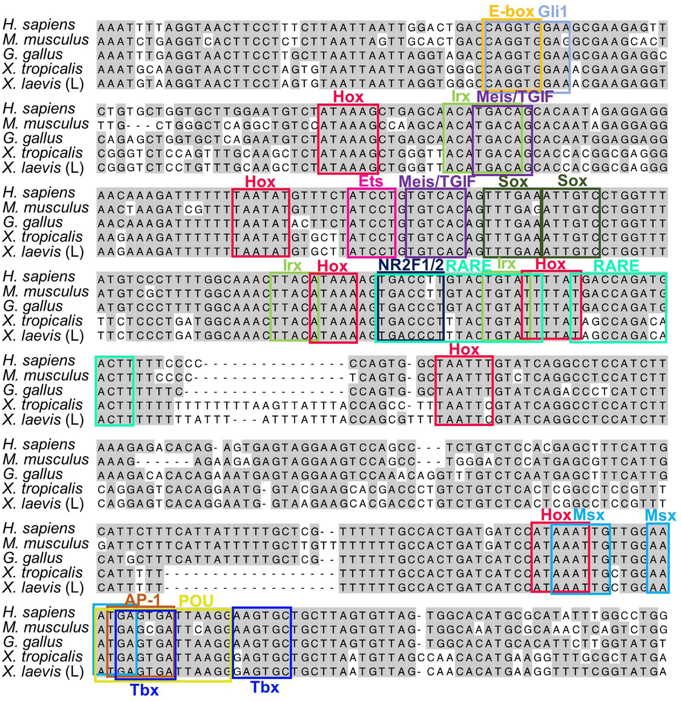 Fig. S4. Alignment of MFCS1 highly conserved sequences (identical sequences shown in Fig. 4A) from the human, mouse, chick, X. tropicalis and X. laevis. Nucleotides identical in more than two sequences are shaded in grey. Conserved transcription factor-binding motifs (Hox and other transcription factors) are boxed.
