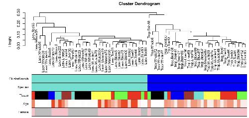 Fig. 1. Unsupervised hierarchical clustering of Xenopus tissues. The clustering height (y-axis) can be interpreted as distance based on pairwise correlation coefficients. Color bands underneath indicate clustering branch (corresponding to a height cut-off of 0.29 on the y-axis), frog species (blue, tropicalis; turquoise, laevis), tissue type (see the labels), age (red corresponds to old age), and sex (pink, female; blue, male; grey, unknown). Sex was unknown for samples where the animals were too young to determine their sex.