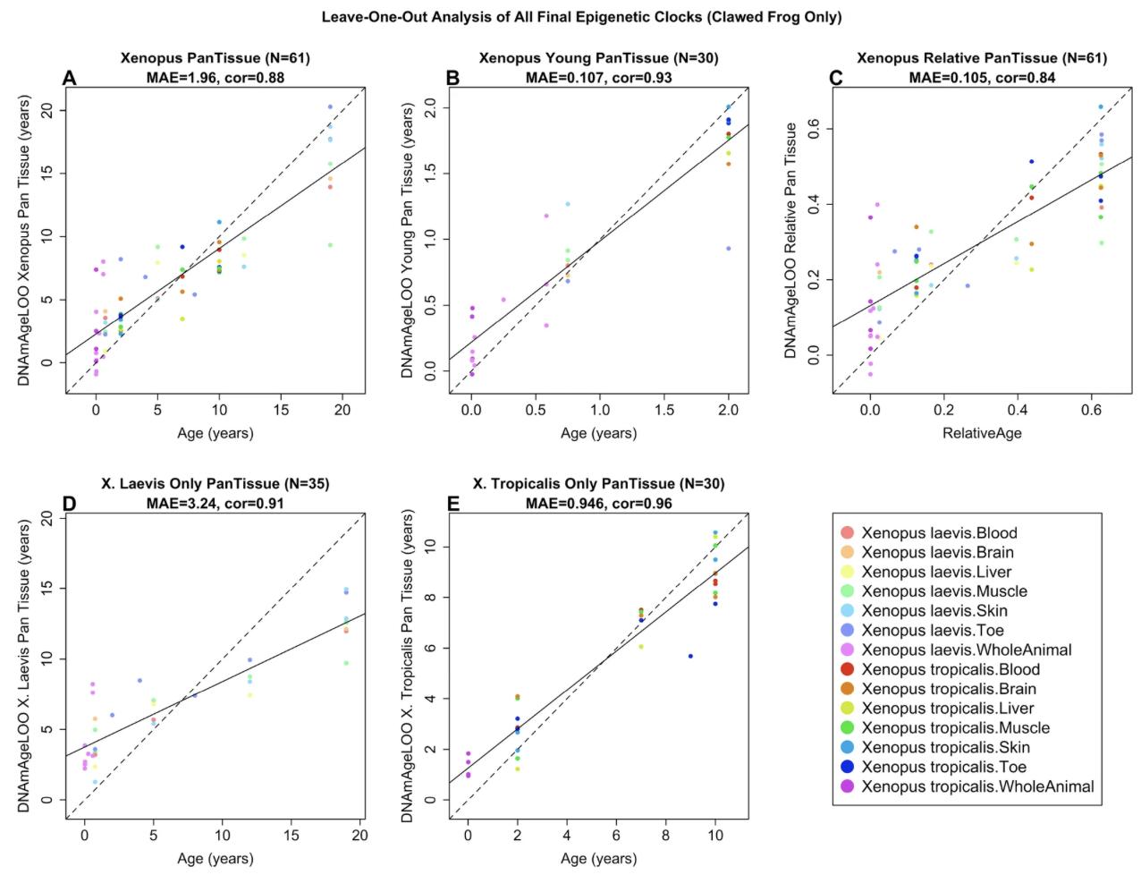 Fig. 2. Cross-validation study of epigenetic clocks for Xenopus. Leave-one-sample-out estimate of DNA methylation age (y-axis, in units of years) versus chronological age (units of years) for A all Xenopus tissues (both species), B all tissues from young Xenopus (age < 2 years), D all tissues from X. laevis, E all tissues from X. tropicalis. C Leave-one-sample-out estimate of DNA methylation relative age (y-axis, values range from 0 to 1) versus relative age for all Xenopus tissues (both species). Relative age was determined by dividing chronological age (measured in years) by the maximum lifespan (also expressed in years). All clocks are pan tissue clocks, i.e., apply to all considered tissues Each panel reports the sample size (in parenthesis), correlation coefficient, median absolute error (MAE).