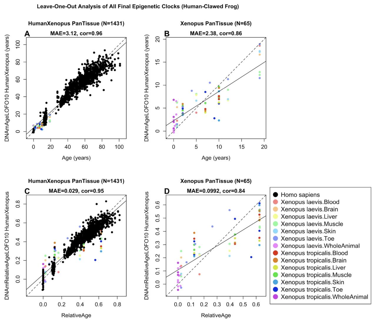 Fig. 3. Cross-validation study of epigenetic clocks for Xenopus and humans. Ten-fold cross validation analysis of the human-clawed frog clocks for A, B chronological age and C, D relative age, respectively. A, C Human samples are colored in black and Xenopus samples are colored by species and tissue type, and analogous in B, D but restricted to Xenopus samples (colored by Xenopus tissue type). Relative age was determined by dividing chronological age (measured in years) by the maximum lifespan (also expressed in years). The relative age clock allows for alignment and biologically meaningful comparison between species with different lifespan (clawed frogs and humans). Each panel reports the sample size (in parenthesis), correlation coefficient, median absolute error (MAE)
