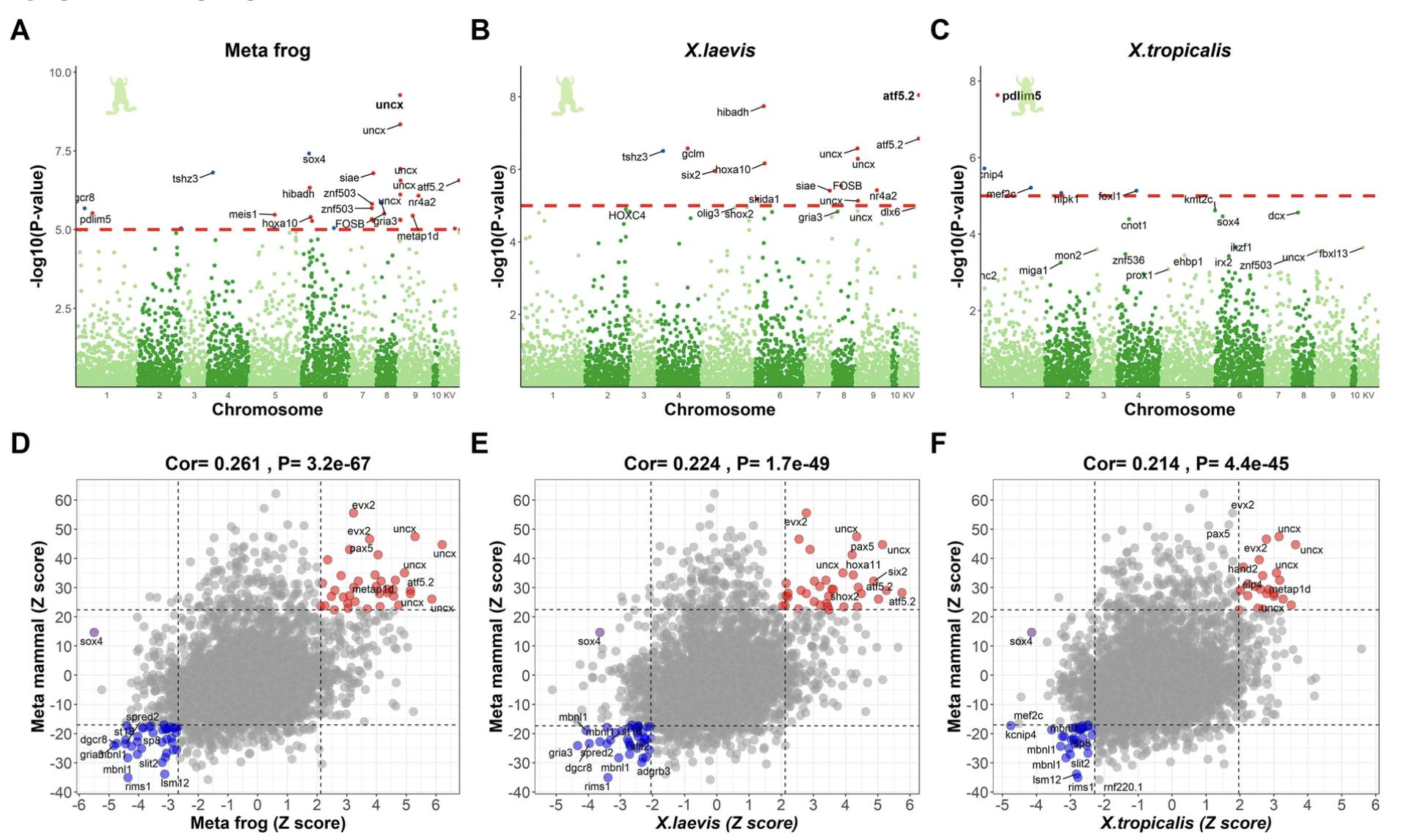 Fig. 4. EWAS of age in Xenopus. The top panels display Manhattan plots for EWAS of age A Stouffer’s method meta-analysis that combines B X. laevis, and C X. tropicalis across all tissue types. The red dash lines indicate suggestive levels of significance at P < 1.0E-05. CpGs are colored in red or blue for positive or negative age correlations, respectively. The y-axis displays -log base 10 transformed P-value and the x-axis displays chromosome number based on the X. tropicalis genome (v9.1.102). Chromosome KV denotes the alias names for the CpGs with unspecified chromosomes. D–F Display the scatter plots between frog EWAS of age and Eutherian EWAS of age, based on Z statistics. Each of the 4239 points in the scatter plot correspond to a CpG that is present on our mammalian array and maps to the X. tropicalis genome. The title presents the Pearson correlation and its P-value between the two EWAS Z statistics. The CpG cg17865363 exhibiting highly significant P-value in frog EWAS is annotated by its nearby gene sox4 and marked in purple. Labels are provided for the top 10 hypermethylated/hypomethylated CpGs according to the product of Z scores in x- and y-axis.