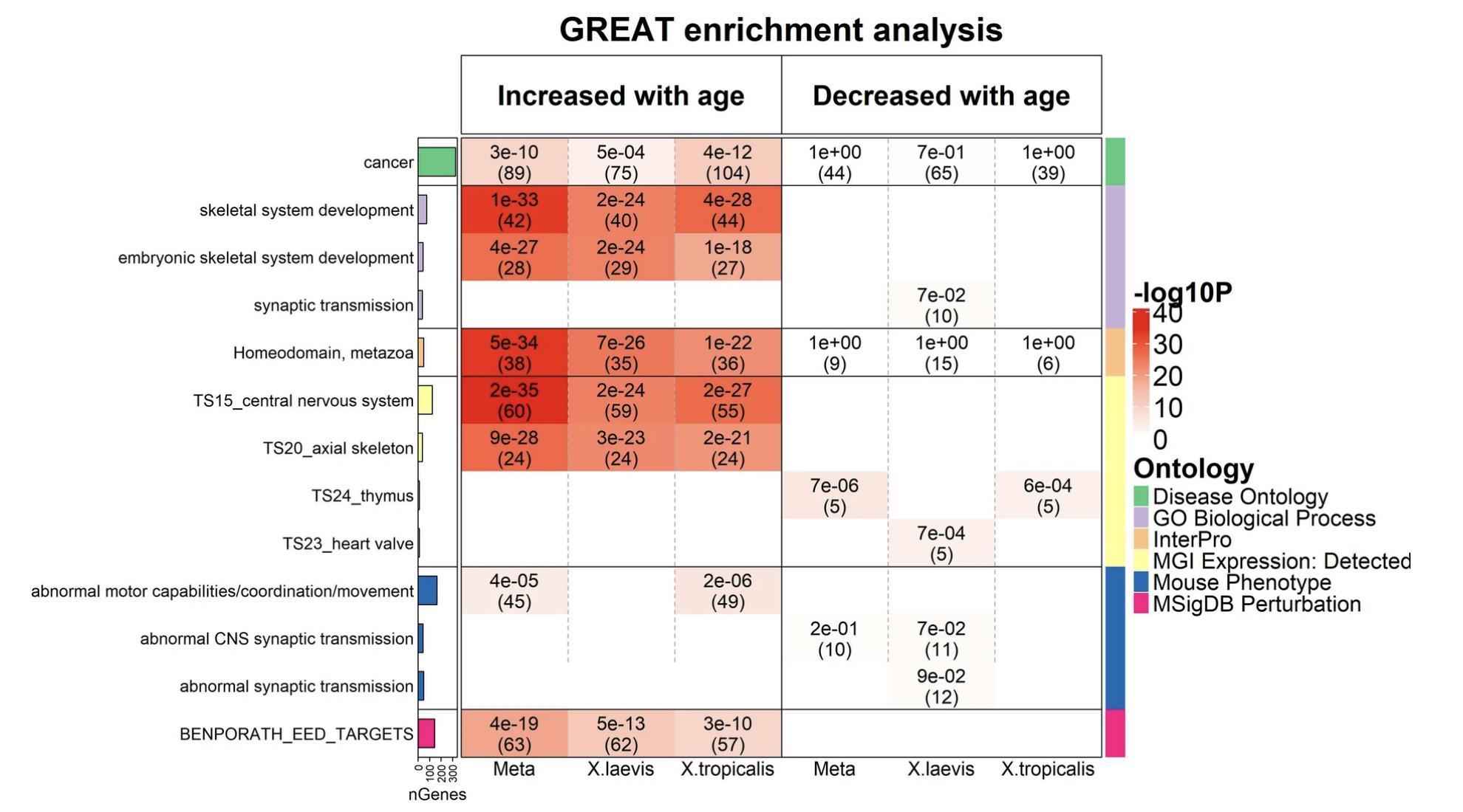 Fig. 5. Genomic region-based GREAT functional enrichment analysis. GREAT functional enrichment analysis was based on the top 500 CpGs that increased or decreased with age from EWAS in (1) meta-analysis, (2) X. laevis, and (3) X. tropicalis, respectively (Suppl. Table 4). The background was based on the genomic regions of the 4239 mammalian CpGs and the assembly in hg19. The y-axis lists the name of a functional gene set/biological pathway, sorted by ontology and the most significant hypergeometric P-value within each ontology. The bar plots in the first column report the total number of genes at each studied gene set adjusted based on our background. The left and right panels of the x-axis list the enrichment results based on the top 500 CpGs with positive and negative age correlation. We list unadjusted hypergeometric P-value (number of overlap genes) at each cell, provided P < 0.1. The heatmap color codes -log10 (P-value). Abbreviations: BENPORATH_EED_TARGETS denotes “EED targets: genes identified by ChIP on chip as targets of the Polycomb protein EED (GeneID = 8726) in human embryonic stem cells.