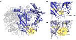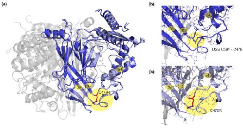 Figure 3. Structural model of the human α-ENaC subunit after energy minimization. (a) Superposition of the energy-minimized wildtype α-ENaC subunit (dark blue cartoon representation) and the C479R mutation (light blue cartoon and red sticks representation) indicates local rearrangements of the loop region between beta-strand β9 and the α4 helix. This region is suggested as a fulcrum for conformational changes during the open–closed transition of the ENaC channel. Subunits β and γ are shown in grey. (b) Close-up view on the wildtype α subunit of ENaC (dark blue) with the conserved disulfide bridge between C394 and C479. This disulfide bridge appears to stabilize the adjacent loop region. (c) Close-up view on the mutated α-ENaC subunit (light blue) shows that the inserted, positively charged arginine at position 479 leads to the repulsion of surrounding, positively charged amino acids of the loop, thereby potentially affecting intrinsic conformational changes and interactions with the lipid membrane.