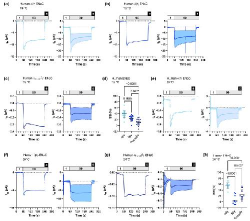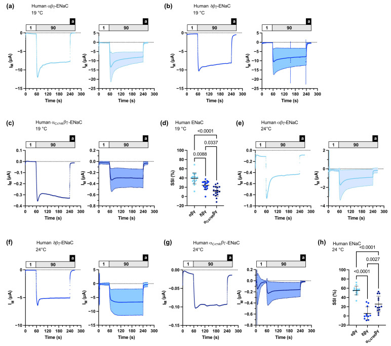 Figure 4. Sodium self-inhibition (SSI) of human αβγ-, δβγ-, or αC479Rβγ-ENaCs heterologously expressed in Xenopus oocytes. (a) Left panel: representative transmembrane (IM) recording of an oocyte expressing αβγ-ENaC at 19 °C; right panel: mean ± SD plotted from experiments as shown in the left panel (n = 18). (b) Left panel: representative transmembrane (IM) recording of an oocyte expressing δβγ-ENaC at 19 °C; right panel: mean ± SD plotted from experiments as shown in the left panel (n = 17). (c) Left panel: representative transmembrane (IM) recording of an oocyte expressing αC479Rβγ-ENaC at 19 °C; right panel: mean ± SD plotted from experiments as shown in the left panel (n = 17). (d) SSI was calculated as the percent decrease in amiloride-baseline subtracted IM within 3 min after switching the extracellular solution from low-sodium (1) to high-sodium (90) ORS. For αβγ-ENaC, n = 18; for δβγ-ENaC, n = 17; for αC479Rβγ-ENaC, n = 17. Kruskal–Wallis test followed by Dunn’s multiple comparisons test. (e–g) Similar to panels (a–c) with recordings performed at 24 °C, for αβγ-ENaC, n = 14; for δβγ-ENaC, n = 11; for αC479Rβγ-ENaC, n = 13. (h) Similar to panel (d) with data from recordings performed at 24 °C, for αβγ-ENaC, n = 14; for δβγ-ENaC, n = 11; for αC479Rβγ-ENaC, n = 13. One-way ANOVA followed by Tukey’s multiple comparisons test. Notes: 1 = low-sodium ORS containing 1 mM NaCl; 90 = high-sodium ORS containing 90 mM NaCl; a = amiloride.