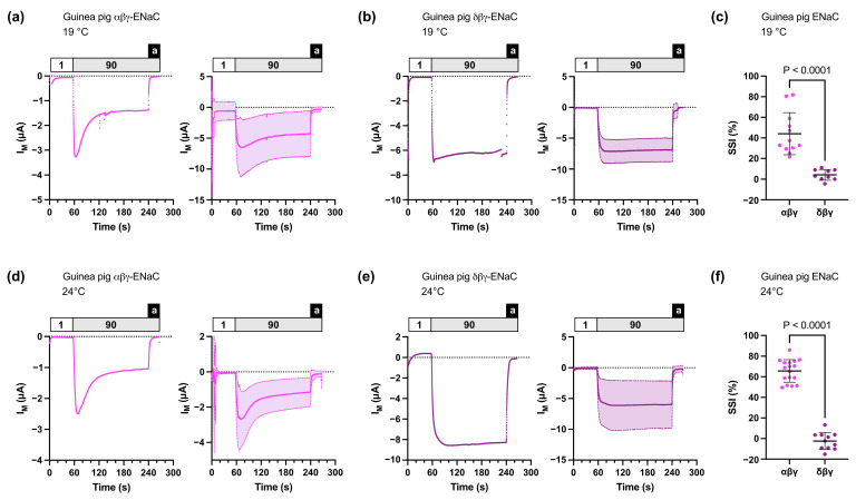 Figure 1. Sodium self-inhibition (SSI) of guinea pig αβγ- or δβγ-ENaCs heterologously expressed in Xenopus oocytes. (a) Left panel: representative transmembrane (IM) recording of an oocyte expressing αβγ-ENaC at 19 °C; right panel: mean ± SD plotted from experiments as shown in the left panel (n = 12). (b) Left panel: representative transmembrane (IM) recording of an oocyte expressing δβγ-ENaC at 19 °C; right panel: mean ± SD plotted from experiments as shown in the left panel (n = 9). (c) SSI was calculated as the percent decrease in amiloride-baseline subtracted IM within 3 min after switching the extracellular solution from low-sodium (1) to high-sodium (90) ORS. For αβγ-ENaC, n = 12; for δβγ-ENaC, n = 9. Student’s unpaired t-test (two-tailed). (d,e) Similar to panels (a,b) with recordings performed at 24 °C, for αβγ-ENaC, n = 17; for δβγ-ENaC, n = 11. (f) Similar to panel (c) with data from recordings performed at 24 °C, for αβγ-ENaC, n = 17; for δβγ-ENaC, n = 11. Student’s unpaired t-test (two tailed). Notes: 1 = low-sodium ORS containing 1 mM NaCl; 90 = high-sodium ORS containing 90 mM NaCl; a = amiloride.